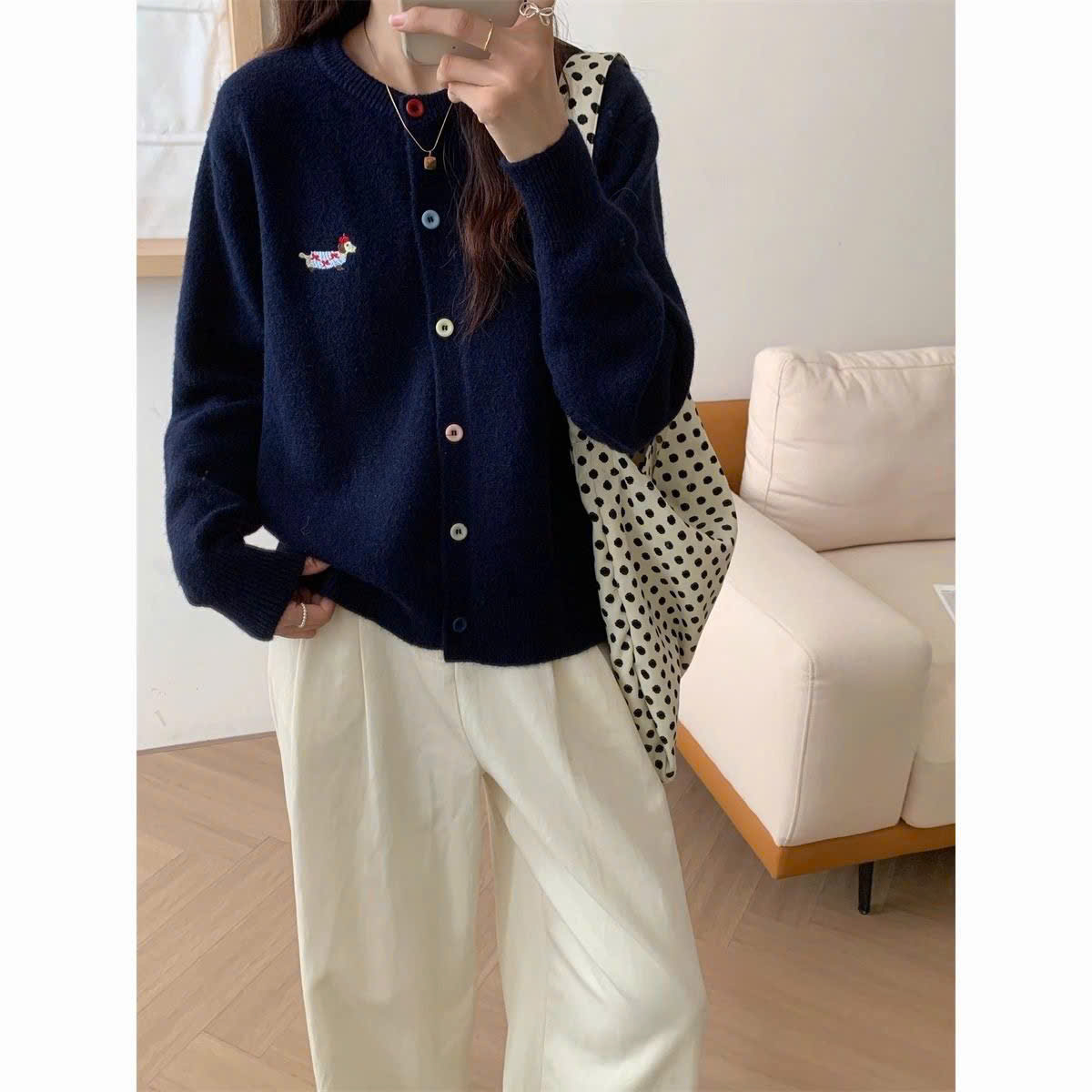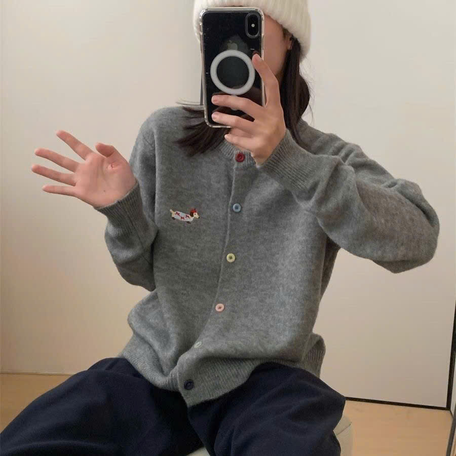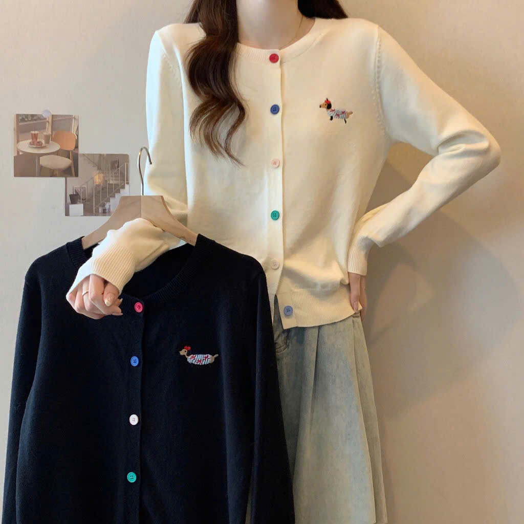 Áo Cadigan Cài Khuy 7 Màu, Áo Khoác Len Mỏng Tay Dài Cổ Tròn Thêu Chó Corgi Nổi Trước Ngực Dễ Thương Hàng Qccc Shopquacam