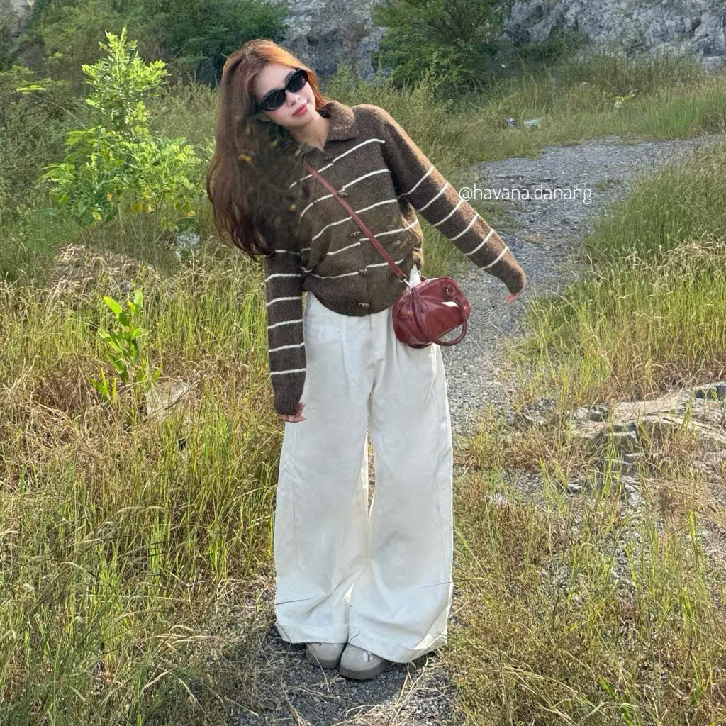- Len sợi dệt dày dặn thích hợp mặc cho mua thu đông trong năm với form áo rộng rãi thoải mái, chất liệu dày ấm