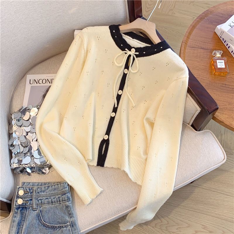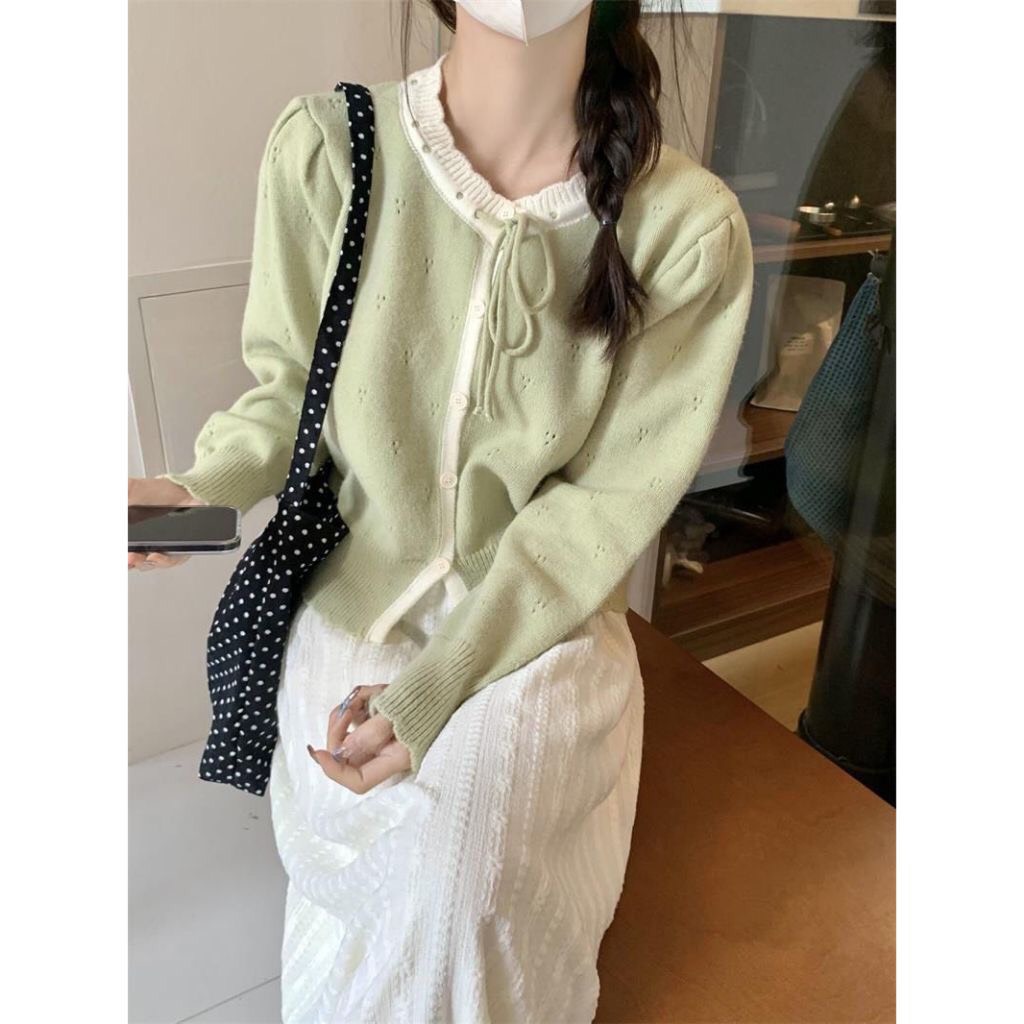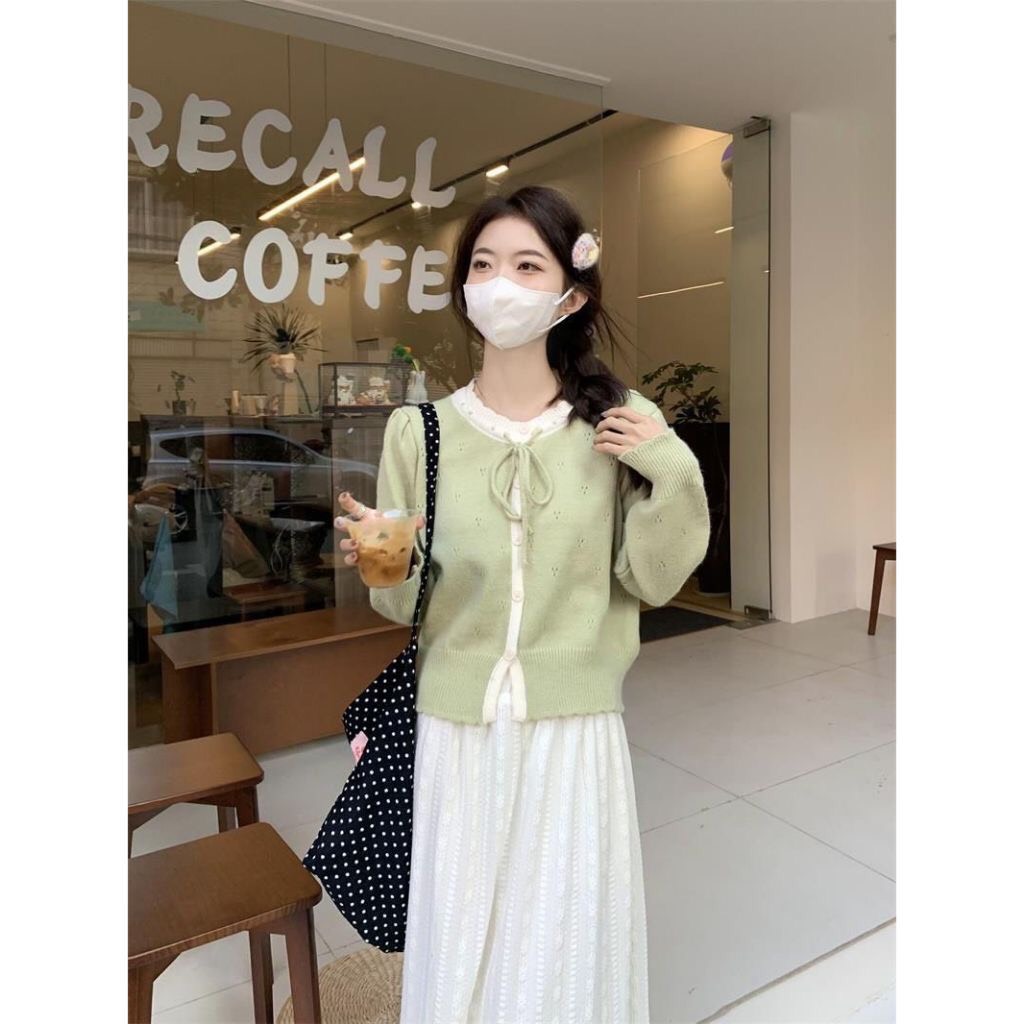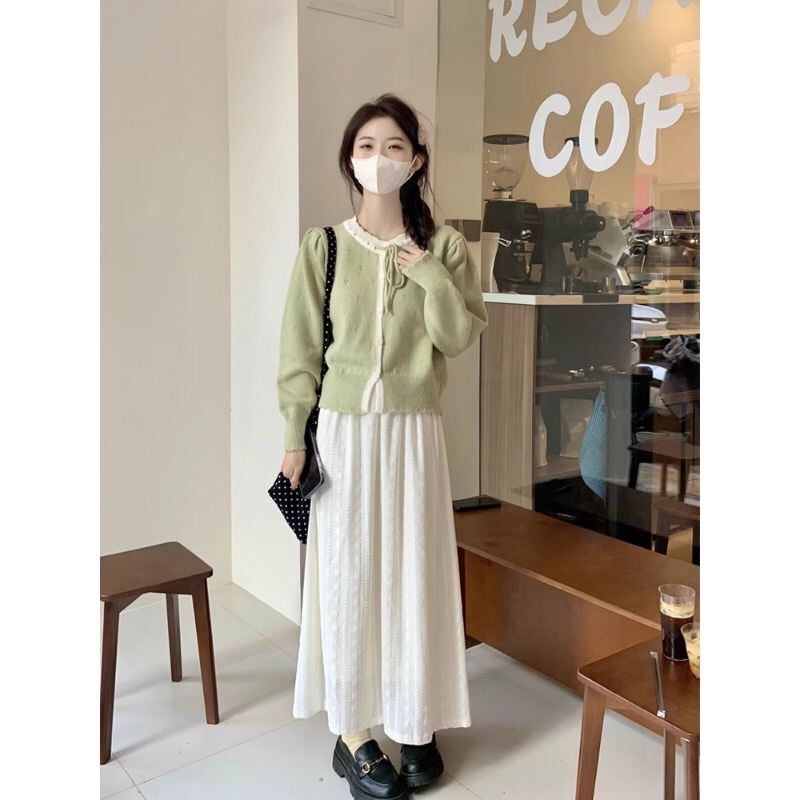 Áo Cadigan Len Nữ, Áo Len Dệt Kim Phối Viền Bèo Cổ 2 Màu Cột Nơ Dáng Vừa Phong Cách Hàn Quốc Dễ Thương Qccc Shopquacam