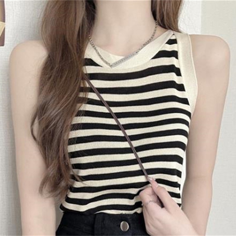 Áo Dệt Kim Sát Nách Cổ Tròn Họa Tiết Kẻ Sọc Thời Trang Mùa Hè Hàn Quốc Cho Nữ
