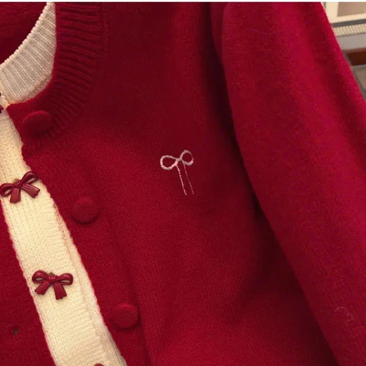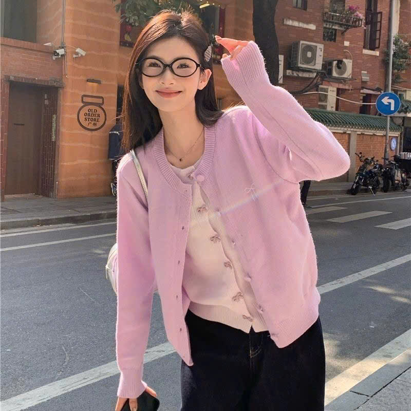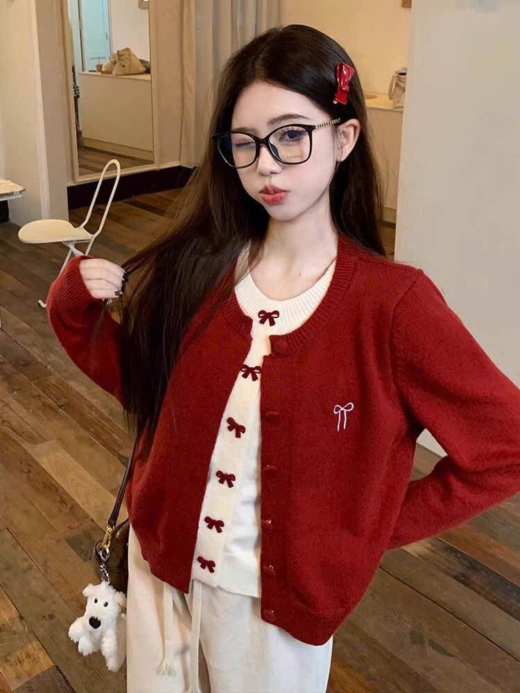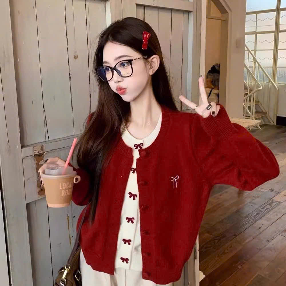 Áo Khoác Len Dài Tay, Áo Cadigan Lông Thỏ Cổ Tròn Phối 2 Lớp Thêu Nơ Ngực Xinh Xăn Cài Cúc Bọc Dạ Hàng Qccc Shopquacam