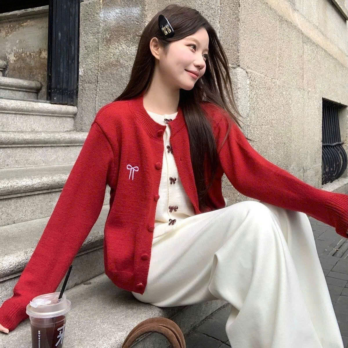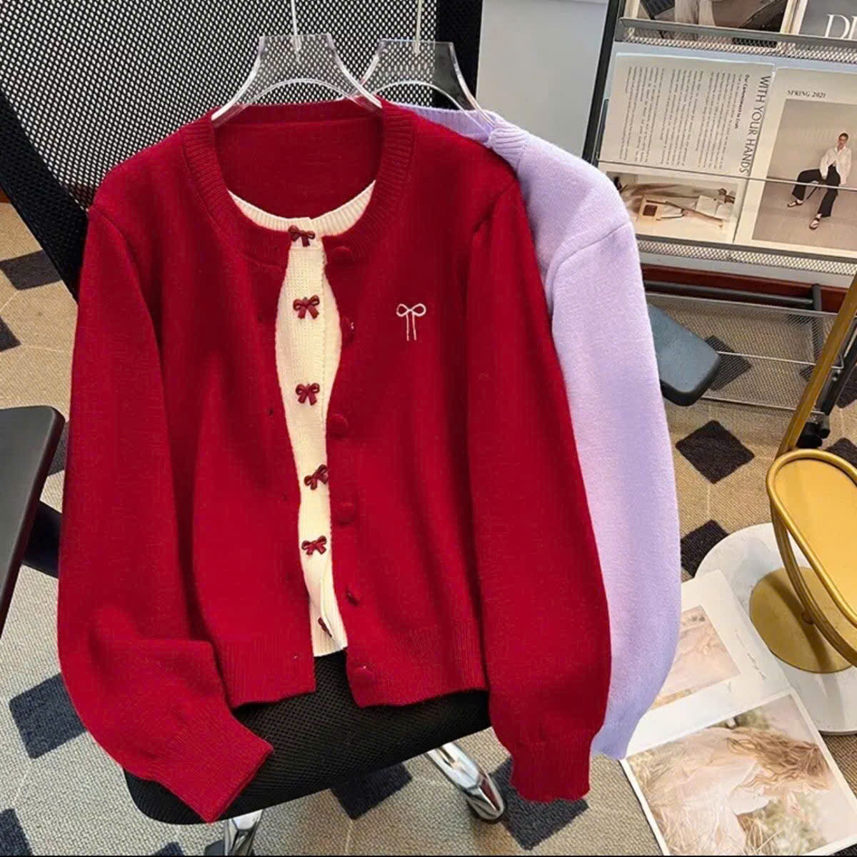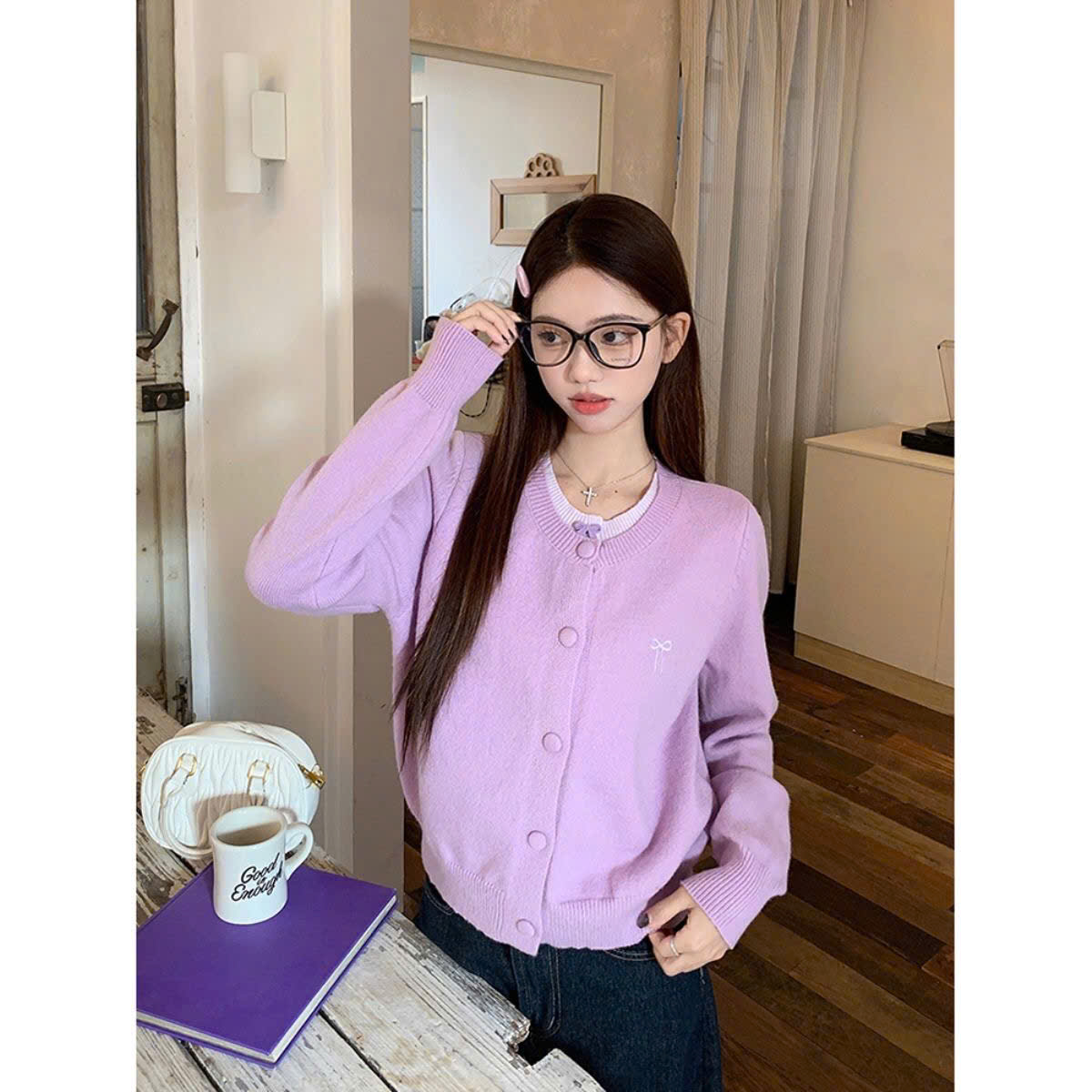 Áo Khoác Len Dài Tay, Áo Cadigan Lông Thỏ Cổ Tròn Phối 2 Lớp Thêu Nơ Ngực Xinh Xăn Cài Cúc Bọc Dạ Hàng Qccc Shopquacam