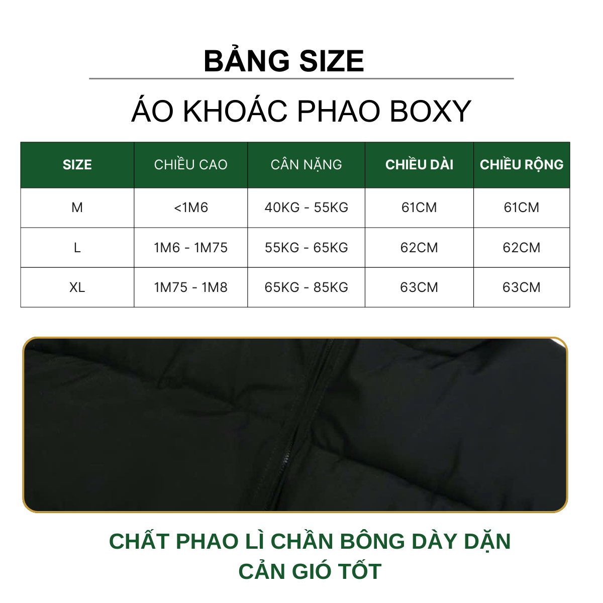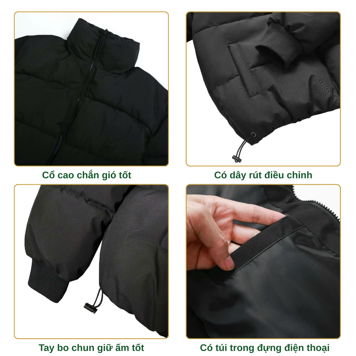 Chất liệu cao cấp: Vải phao dày dặn, bền đẹp, giữ ấm hiệu quả trong mùa thu đông.