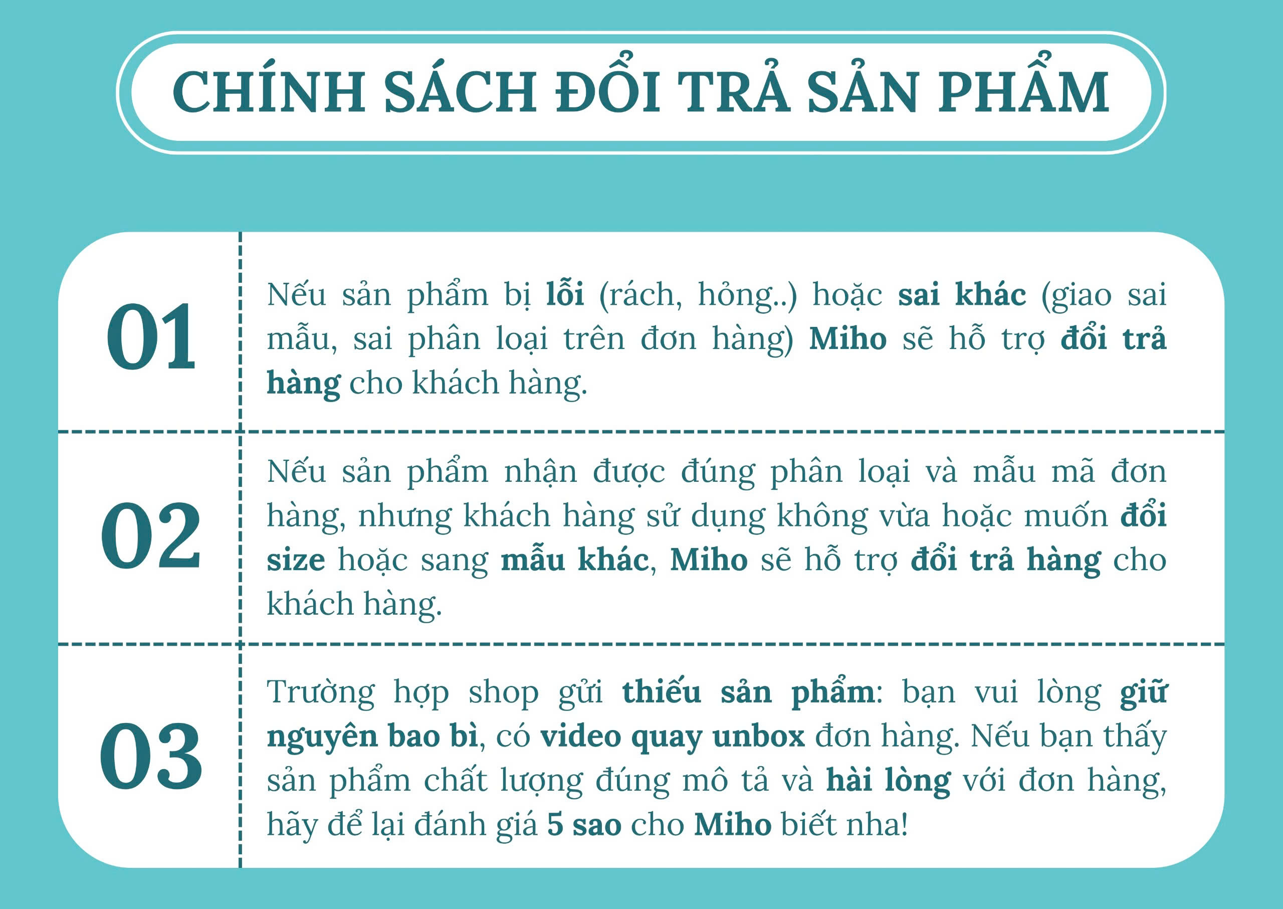 - Sản phẩm có lỗi, sản phẩm không đúng size, không đúng mẫu như đơn hàng khách đặt, không đủ số lượng đặt sẽ được Miho hỗ trợ nhanh nhất.