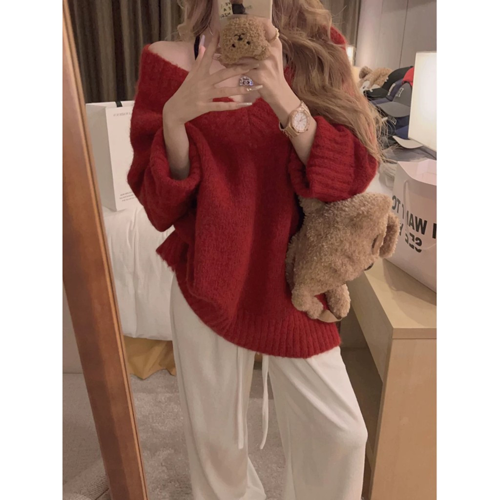Áo len đỏ Áo noel tết cổ chữ V cao cấp phong cách lười Áo dệt kim dễ phối mặc ngoài rộng rãi mẫu mới 2024