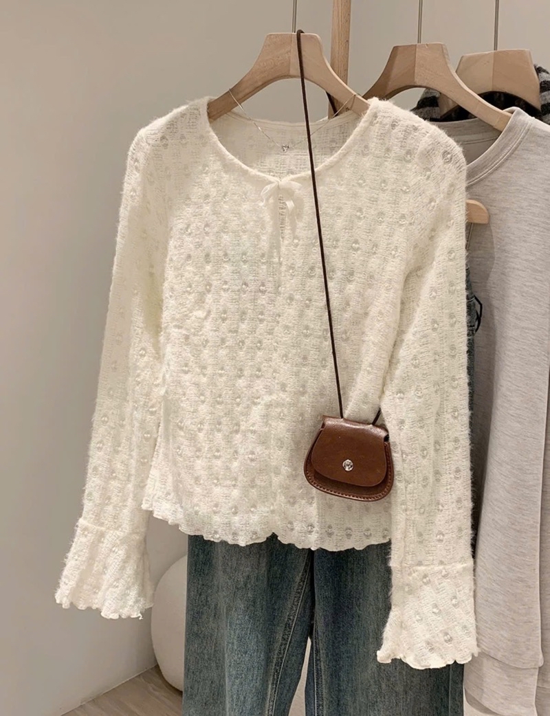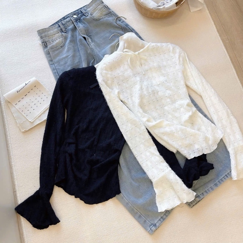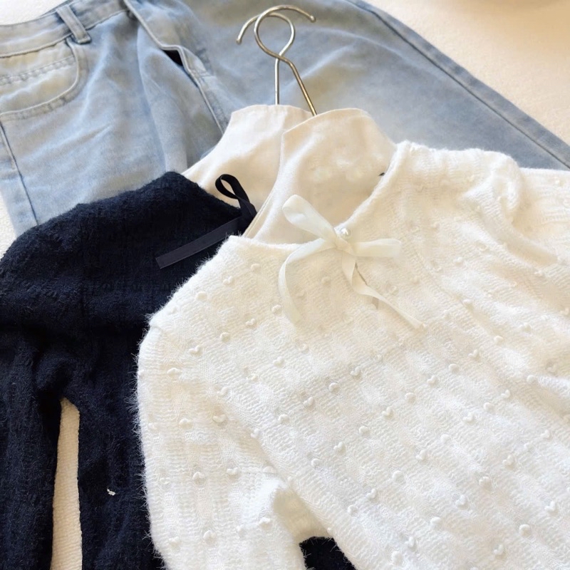Áo len mỏng thắt nơ cổ dài tay loe hoạ tiết chấm bi