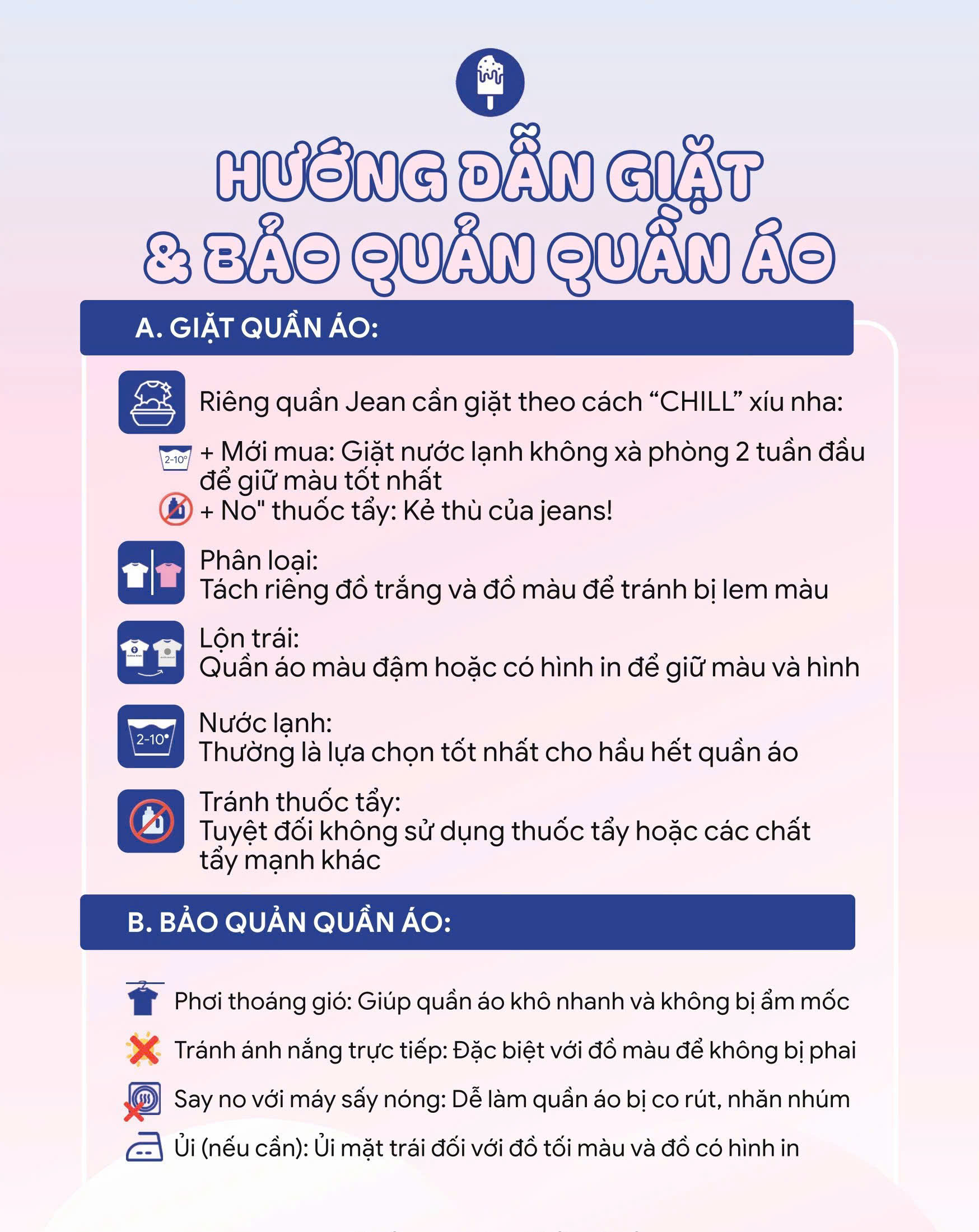 Phân loại màu trước khi giặt. Lộn mặt trái sản phẩm ra ngoài.