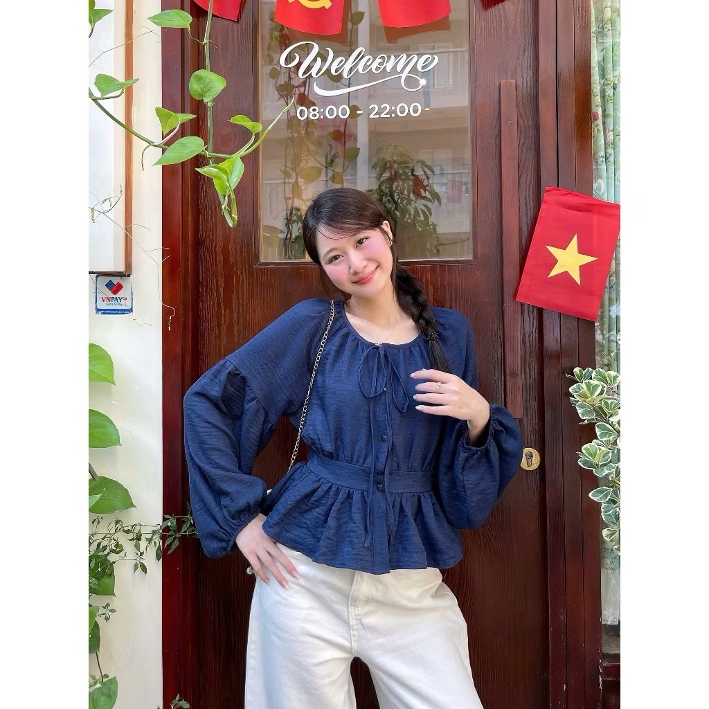 Áo Sơ Mi Cổ Nơ Tay Bồng Thân Bo Eo Chun Lưng Chất Đũi A3168 Susstore Thời Trang Nữ