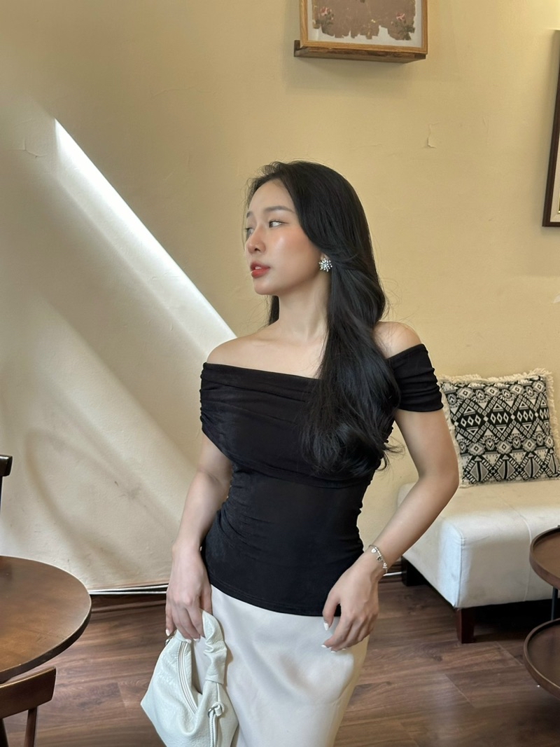 - Mẫu/Chi tiết: Áo trễ vai nhún dài tay ôm body