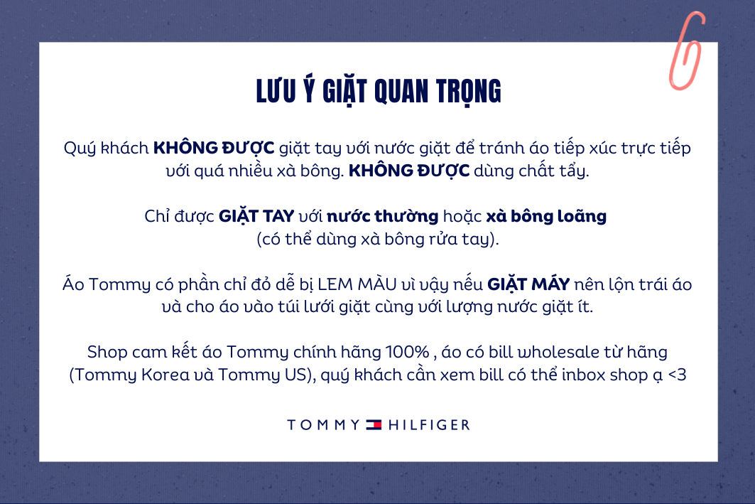 Áo Tommy có phần chỉ đỏ dễ bị LEM MÀU vì vậy quý khách GIẶT MÁY nên lộn trái áo và cho áo vào túi giặt cùng với lượng nước giặt ít.