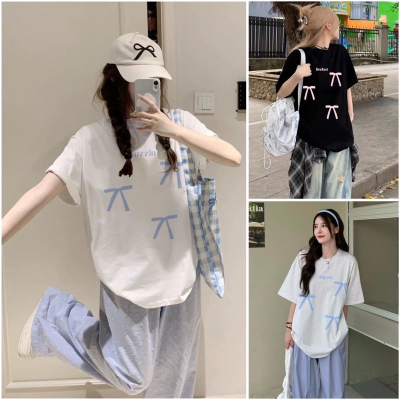 Áo thun nữ , áo phông nữ form rộng chất cotton in hình nơ xanh