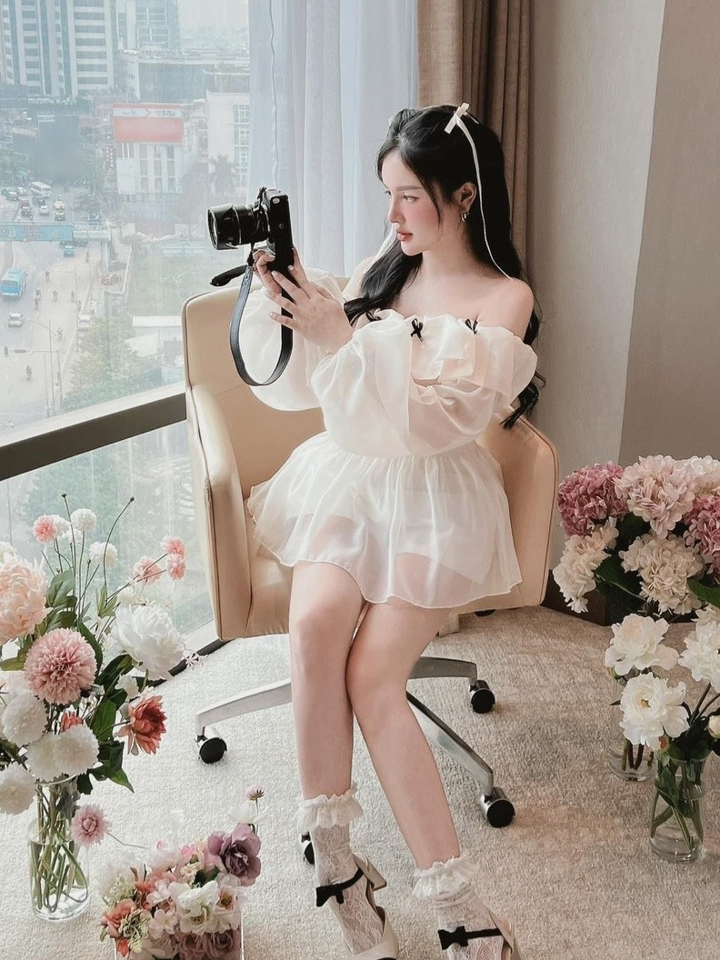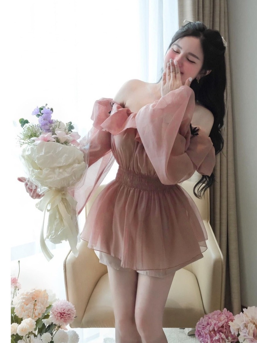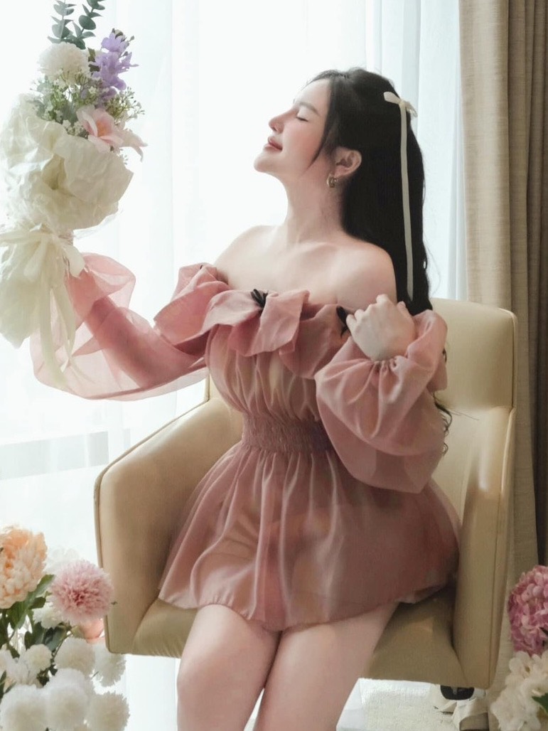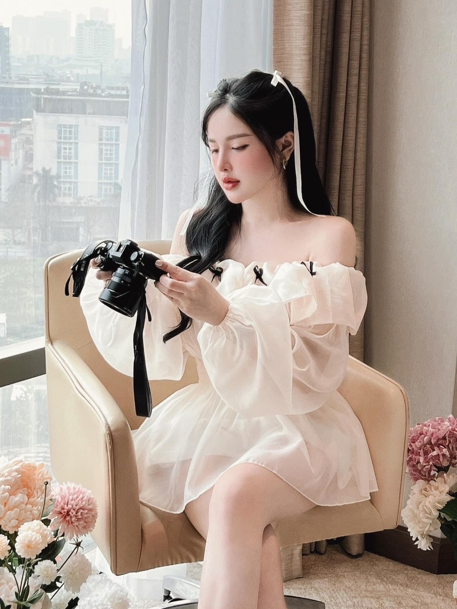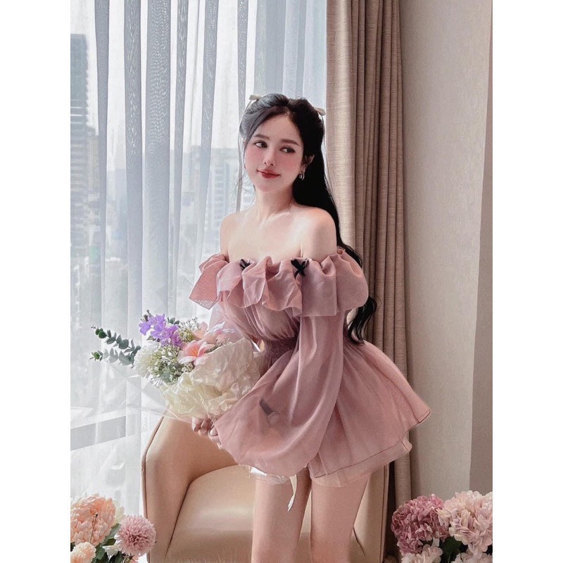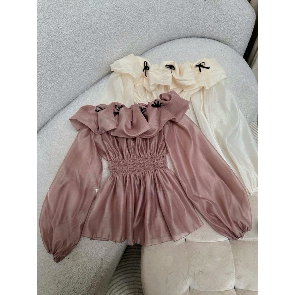 Áo Trễ Vai Tơ Mềm Siêu Bánh Bèo Gắn Nơ Đen Bo Chun Eo