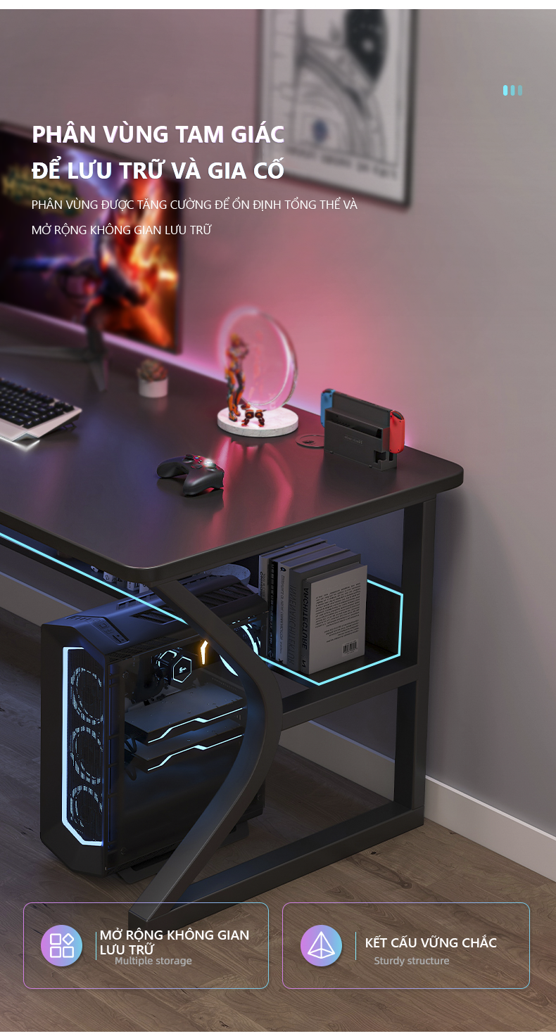2 thanh giằng đỡ mặt bàn: Bàn được trang bị thêm 2 thanh giằng đỡ mặt bàn, tăng cường độ cứng cáp và ổn định. Thiết kế này giúp bàn chịu được trọng lượng lớn, phù hợp cho cả công việc văn phòng và chơi game.