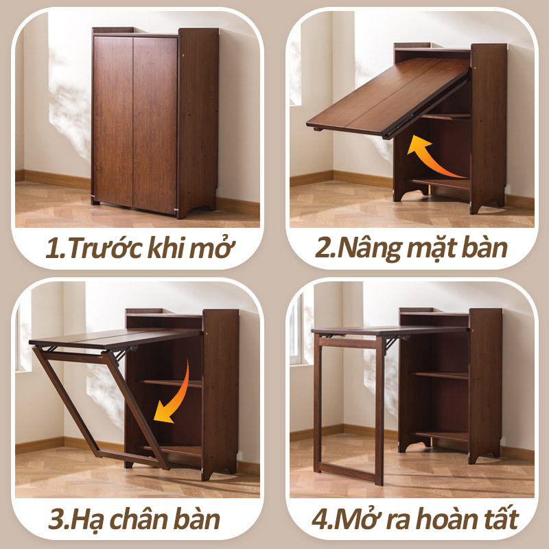 Gấp lại chỉ 2 bước đơn giản 🤏: Khi không dùng, gấp bàn thành tủ nhỏ – chỉ chiếm 0.15m² (nhỏ như tủ gỗ, đặt sau cửa/cạnh giường đều được).