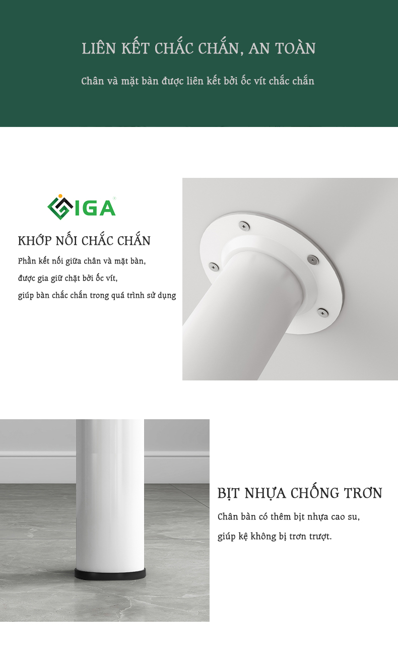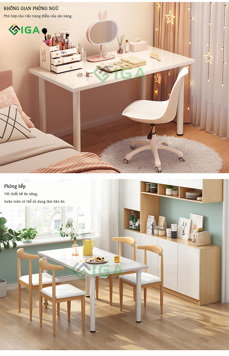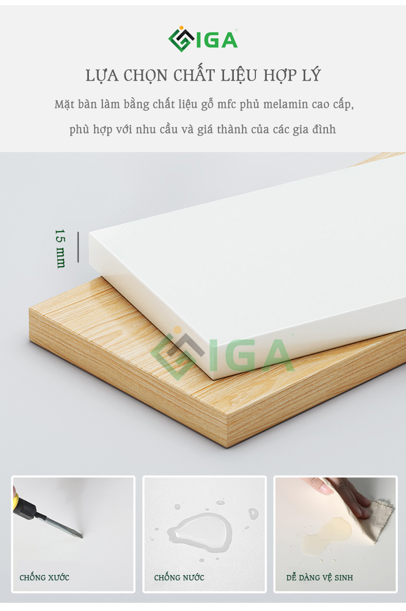 - Chất liệu: Mặt bàn sản xuất từ gỗ MDF phủ melamin cao cấp chống xước chống nước bề mặt sáng bóng