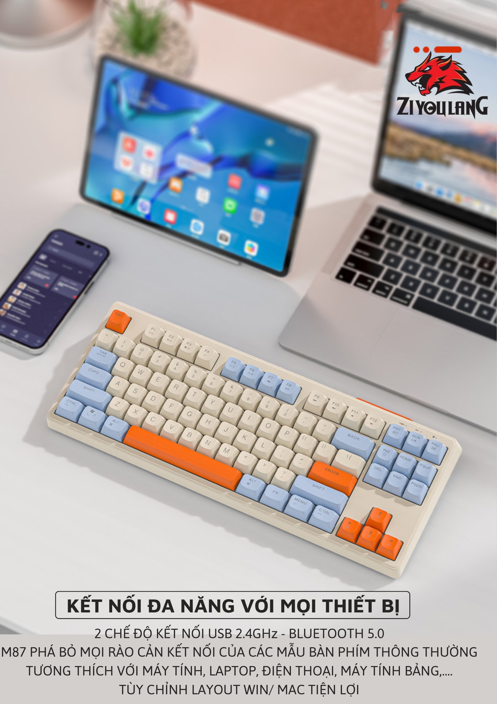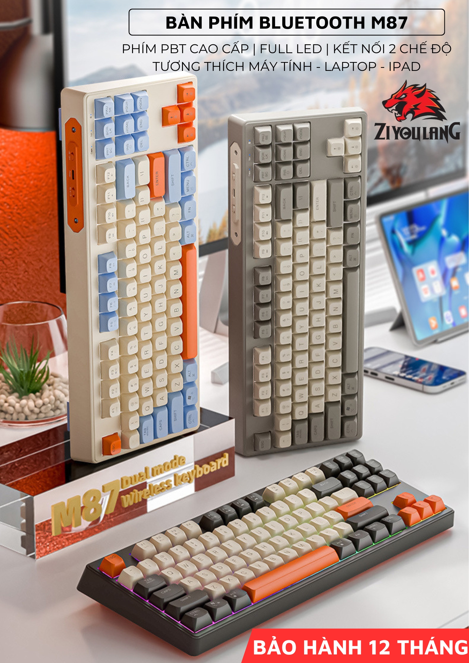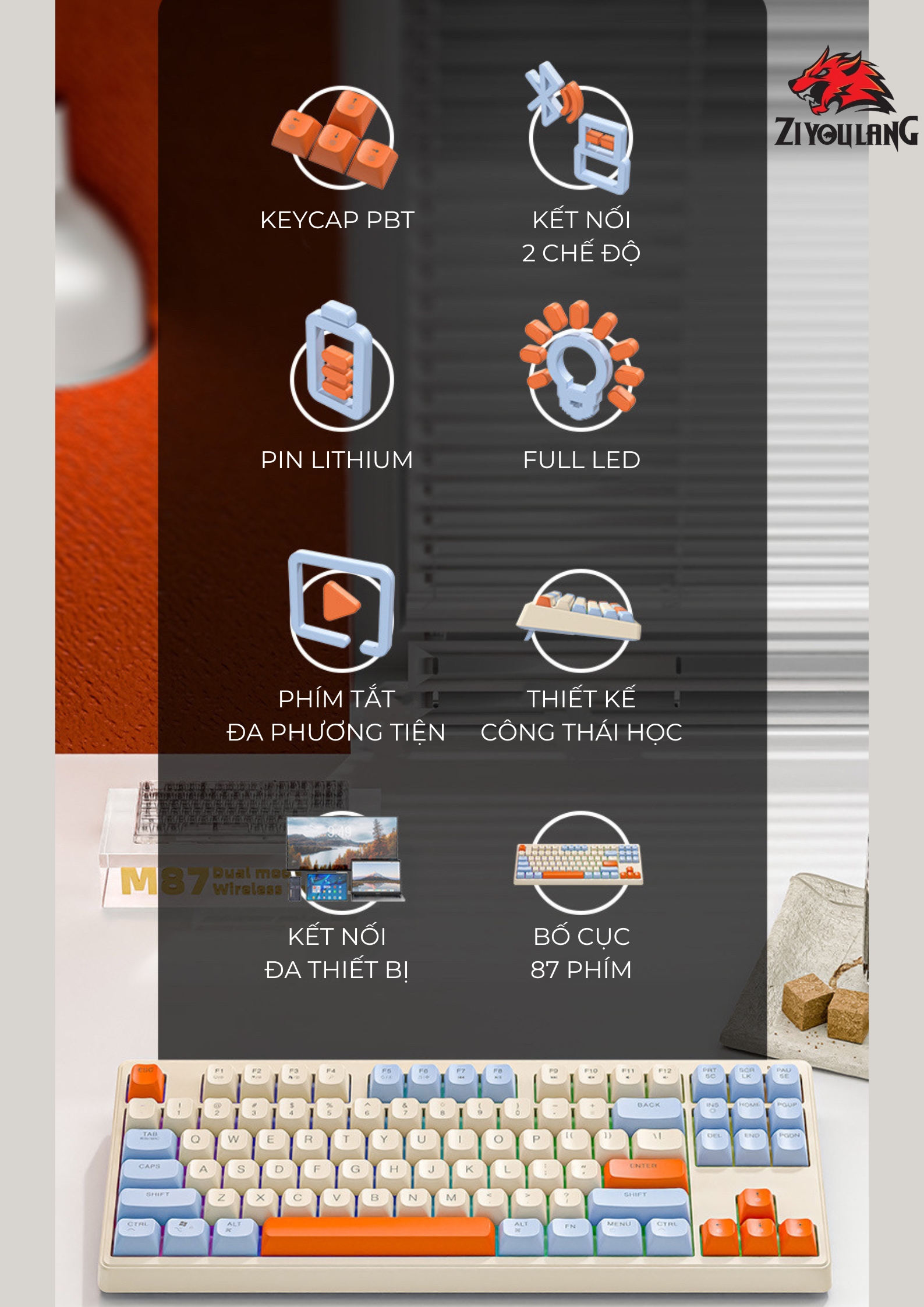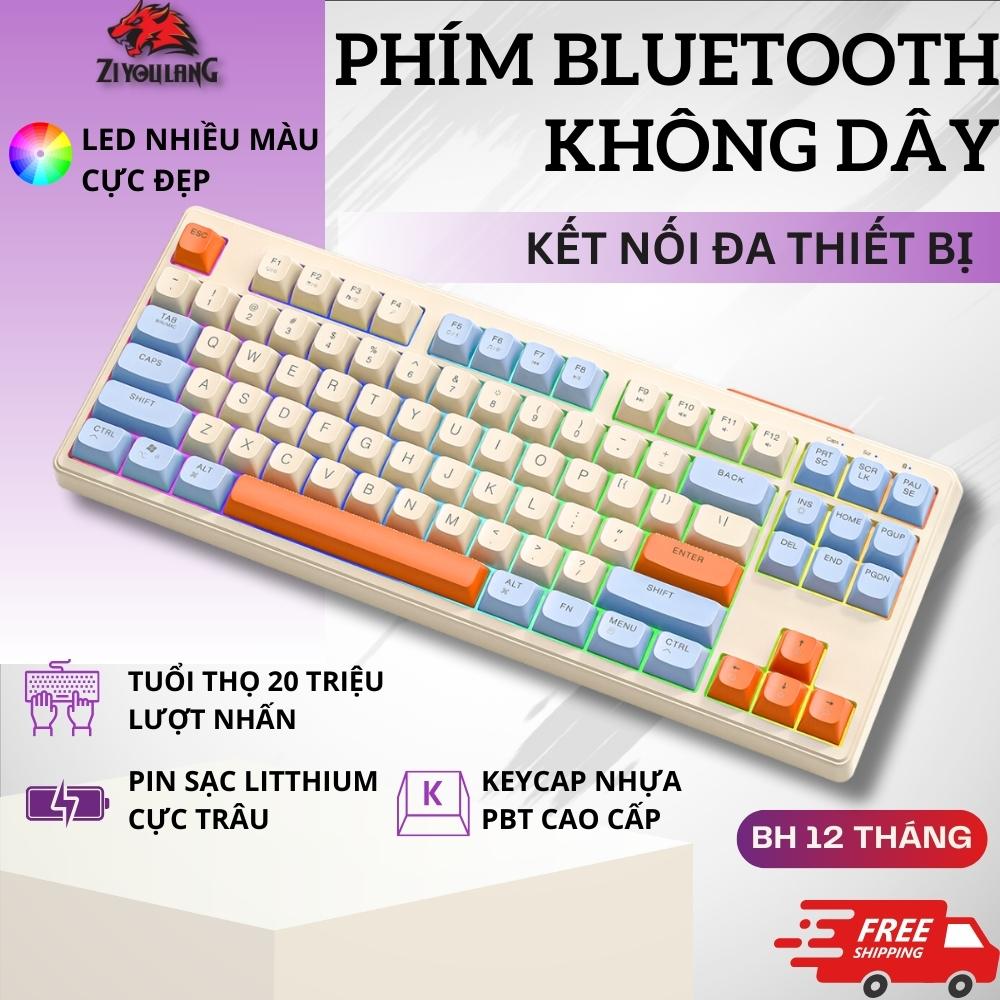 Bàn Phím Không Dây Silent Free Wolf M87 - Led 7 Màu, Phím PBT Cao Cấp, Tương Thích Với Mọi Thiết Bị