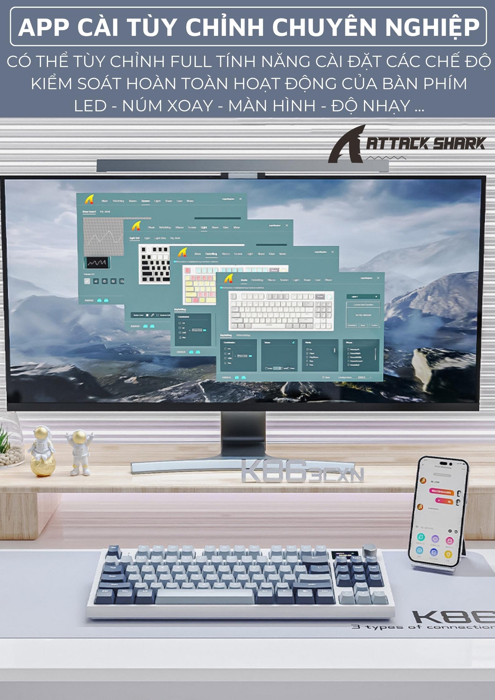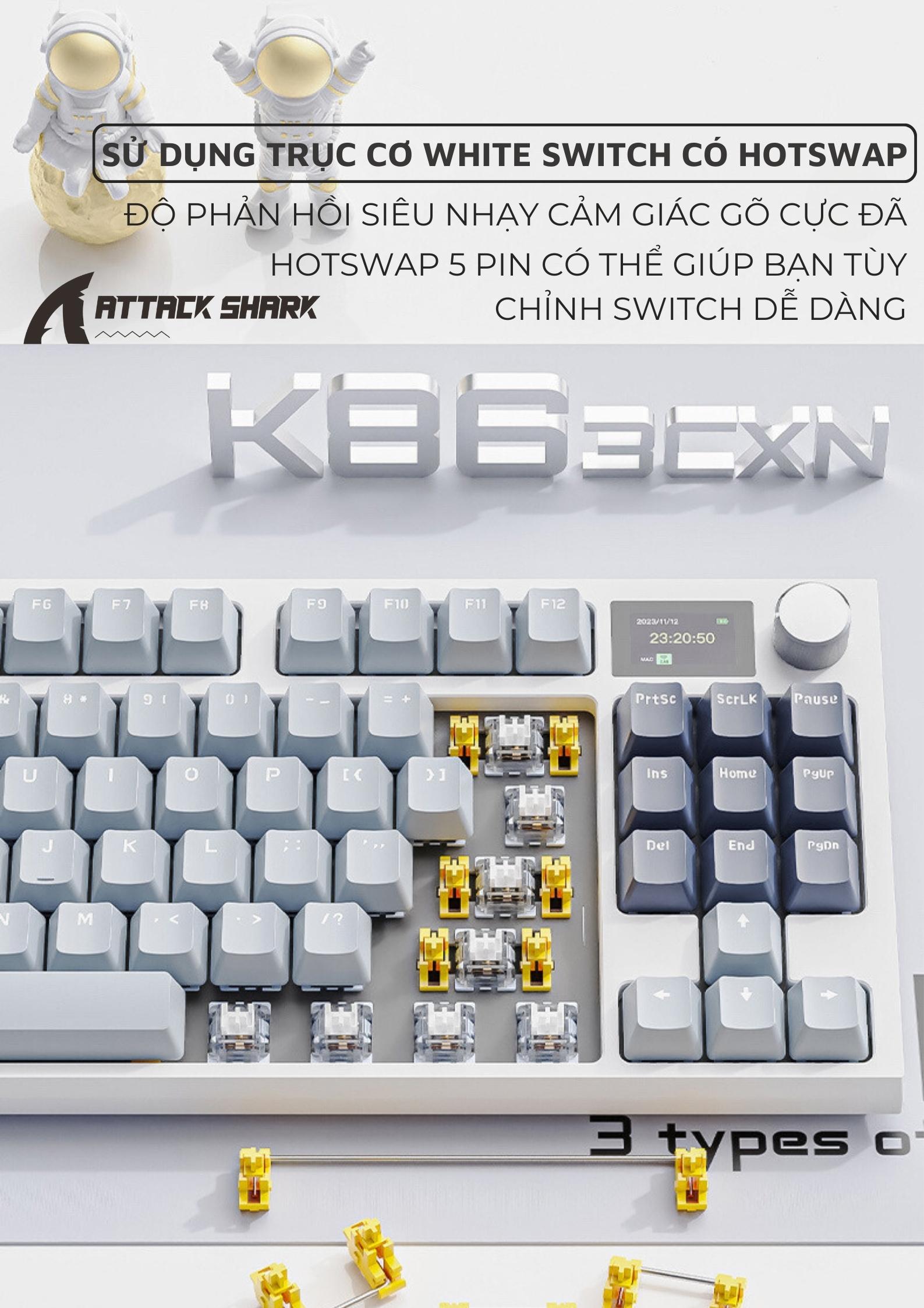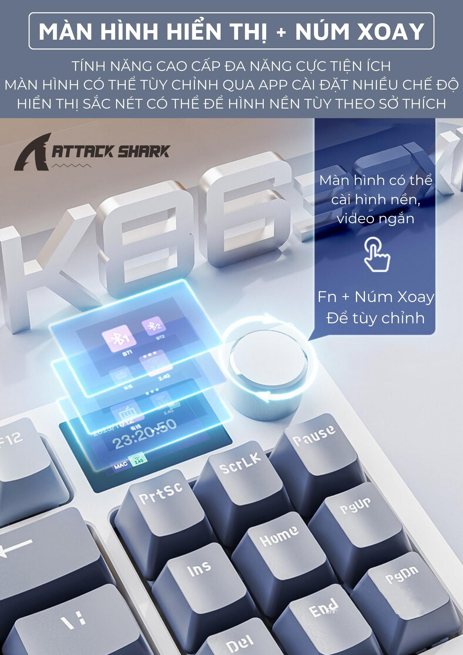 Bàn Phím Cơ Bluetooth Attack Shark K86 Gaming LED RGB Có Màn Hình Tùy Chỉnh HOTSWAP 5 Pin 3 Mod