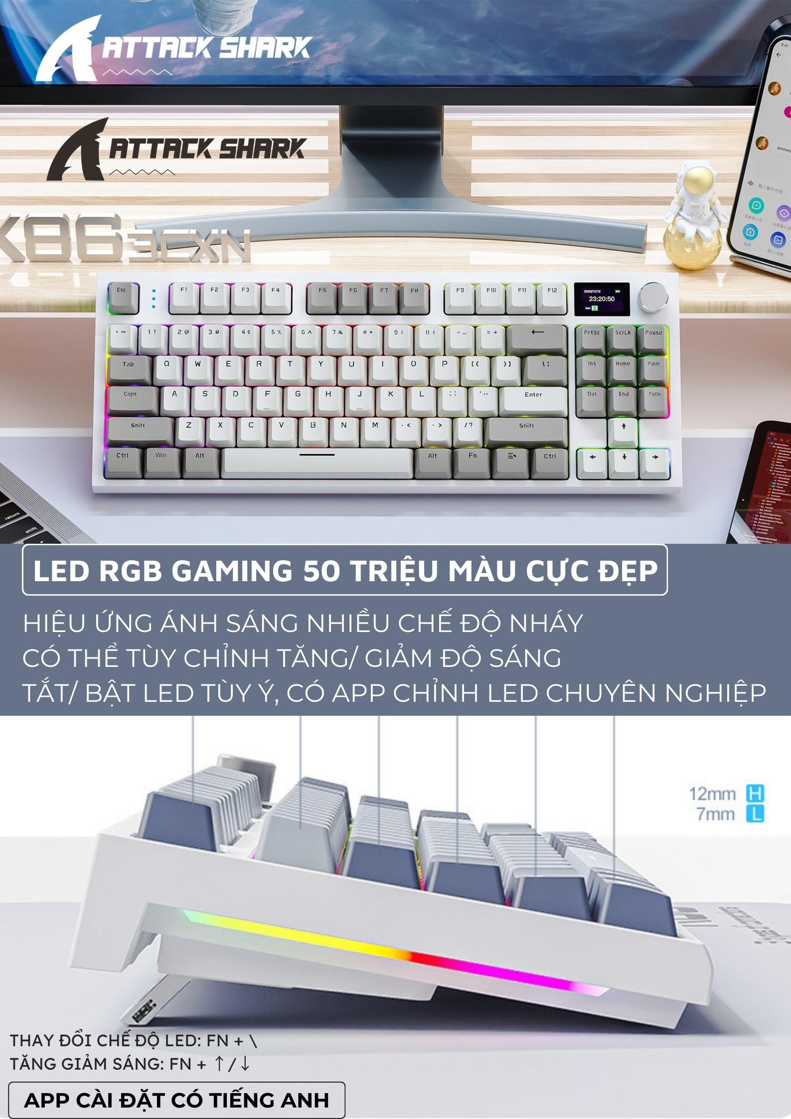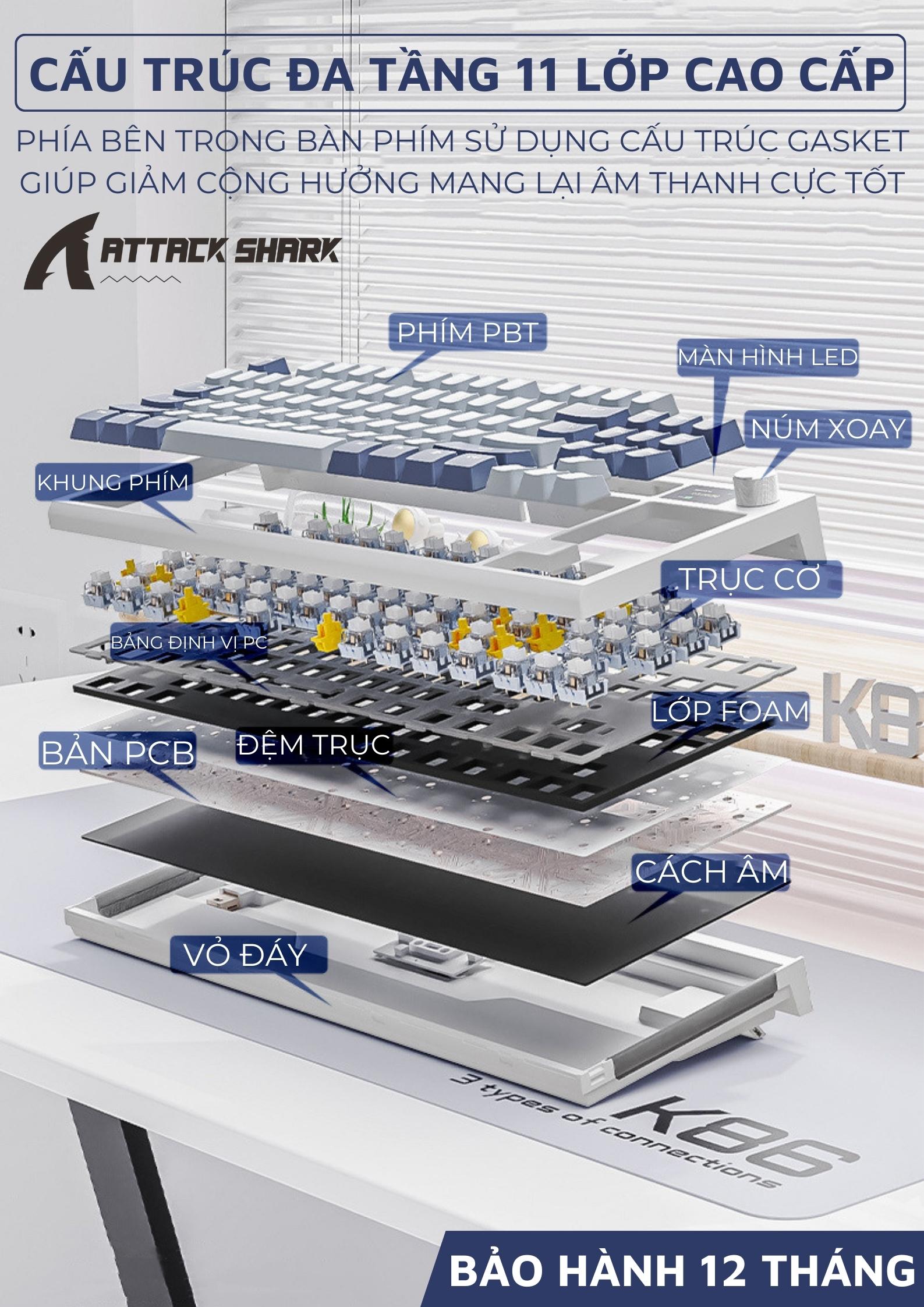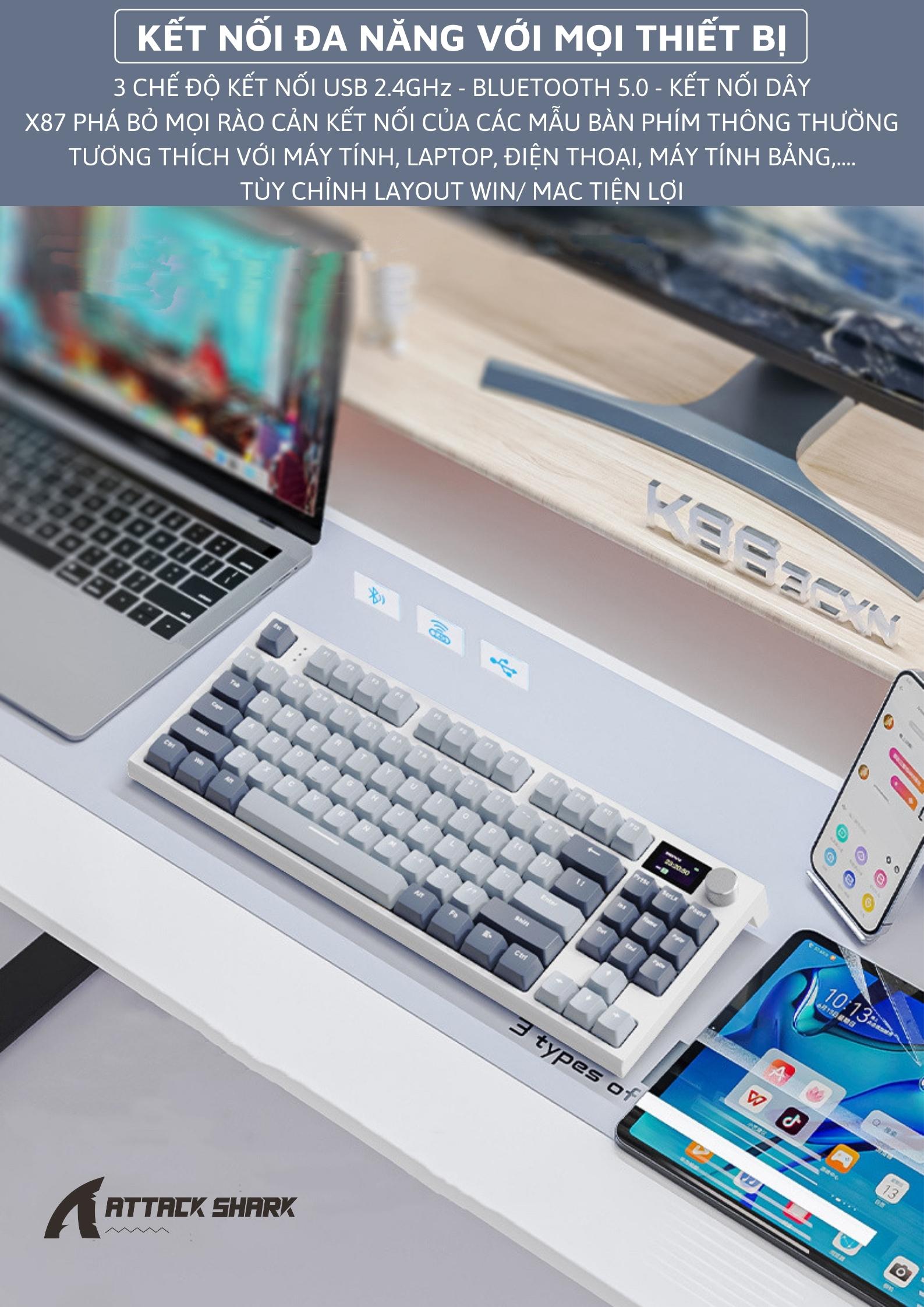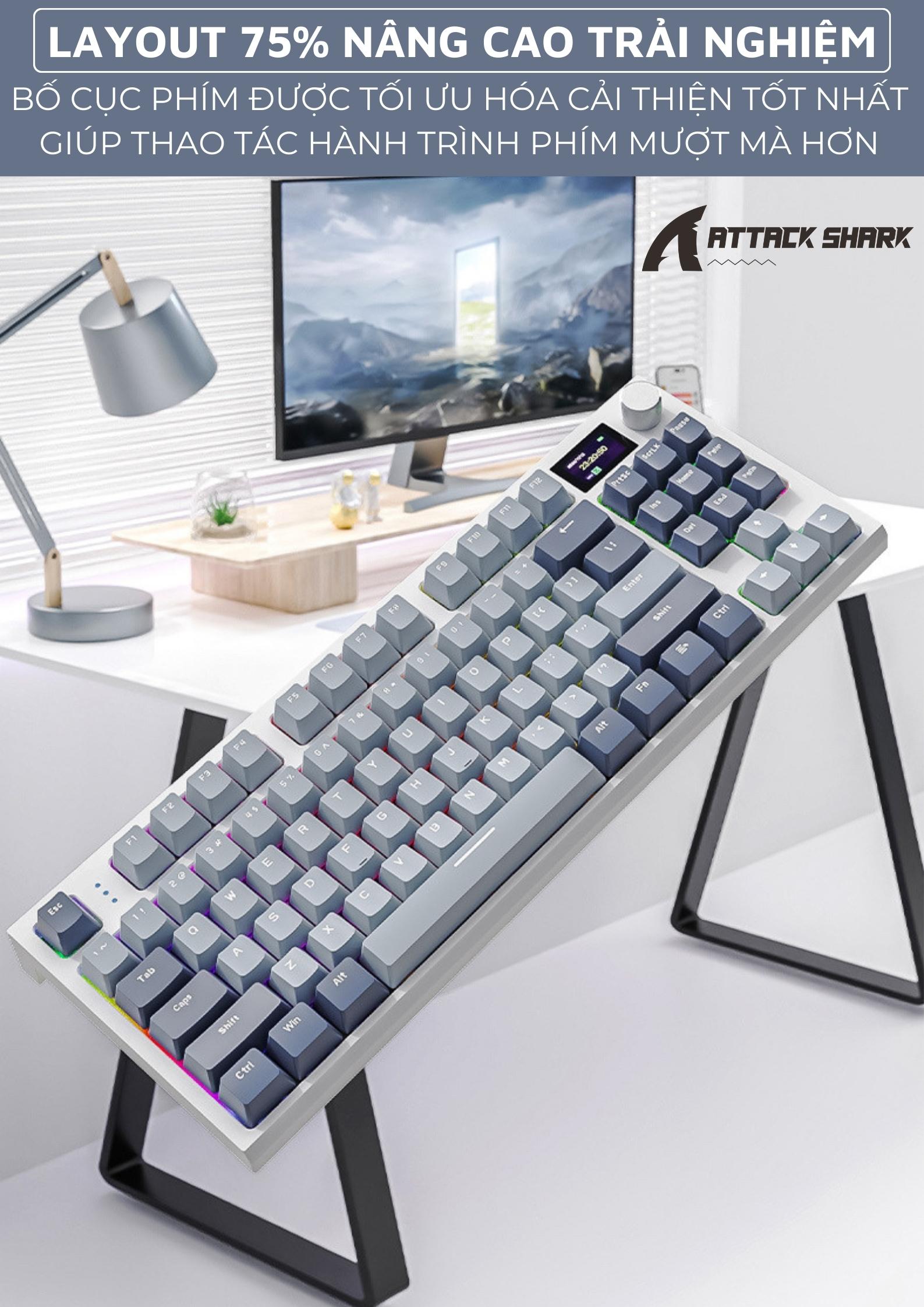 Bàn Phím Cơ Bluetooth Attack Shark K86 Gaming LED RGB Có Màn Hình Tùy Chỉnh HOTSWAP 5 Pin 3 Mod
