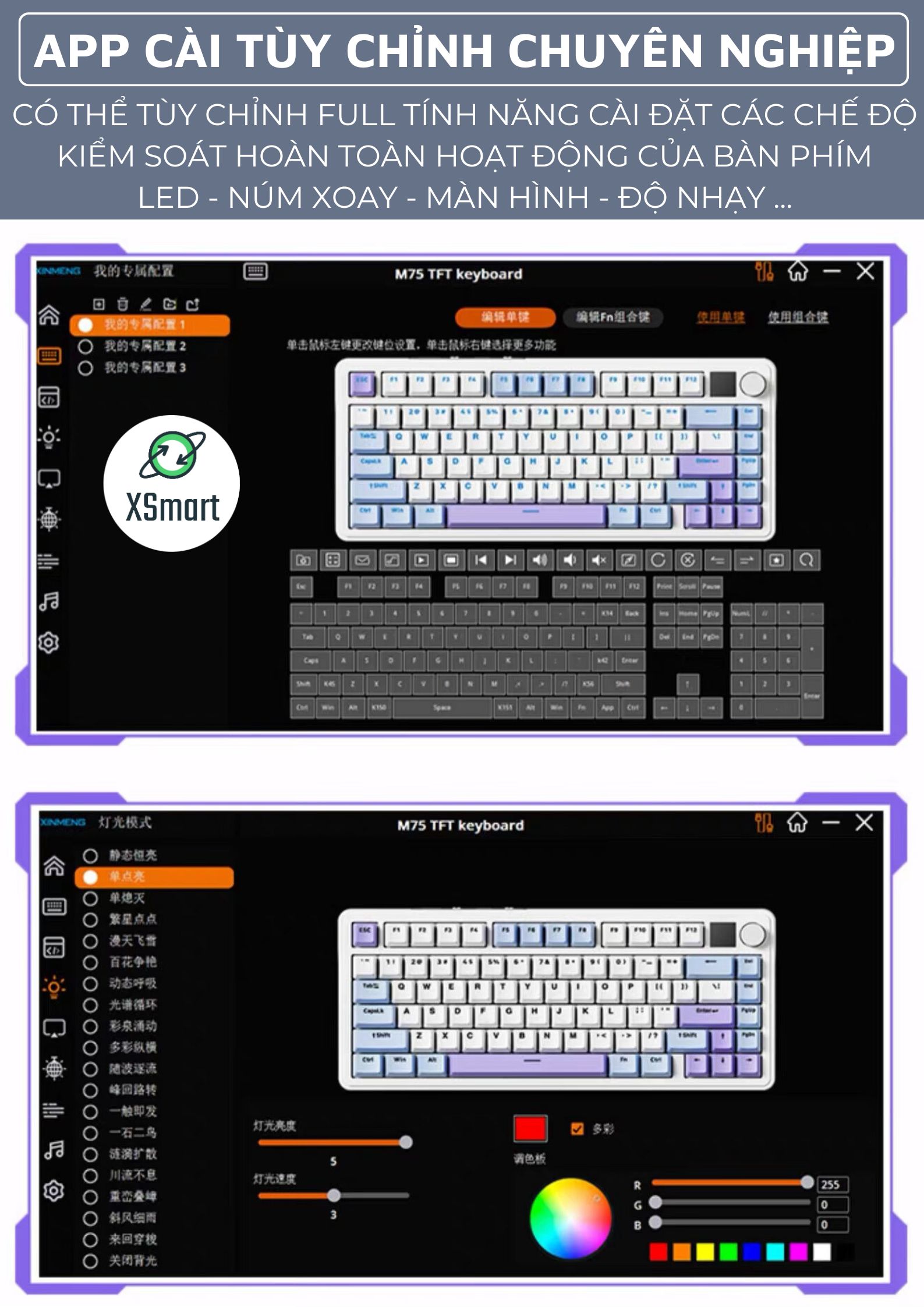 M75 Pro với màn hình Mini và núm vặn điều chỉnh âm lượng, cho phép bạn tùy chỉnh nội dung hiển thị và điều chỉnh âm lượng một cách tiện lợi thông qua phần mềm quản lý.