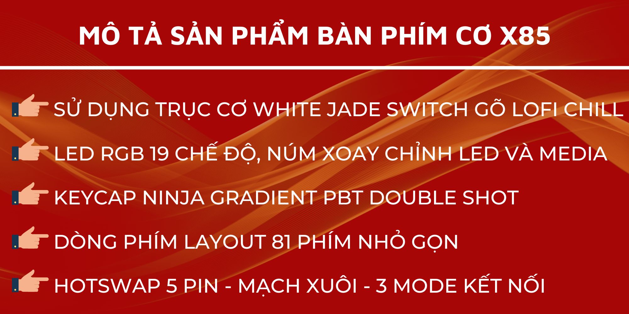 Với cấu trúc Gasket và mạch xuôi, X85 đem đến trải nghiệm gõ phím êm ái, mềm mại, giảm tiếng ồn, và tối ưu sự yên tĩnh. Đặc biệt, bạn có thể sử dụng những bộ keycap cherry profile mà không lo bị cấn.