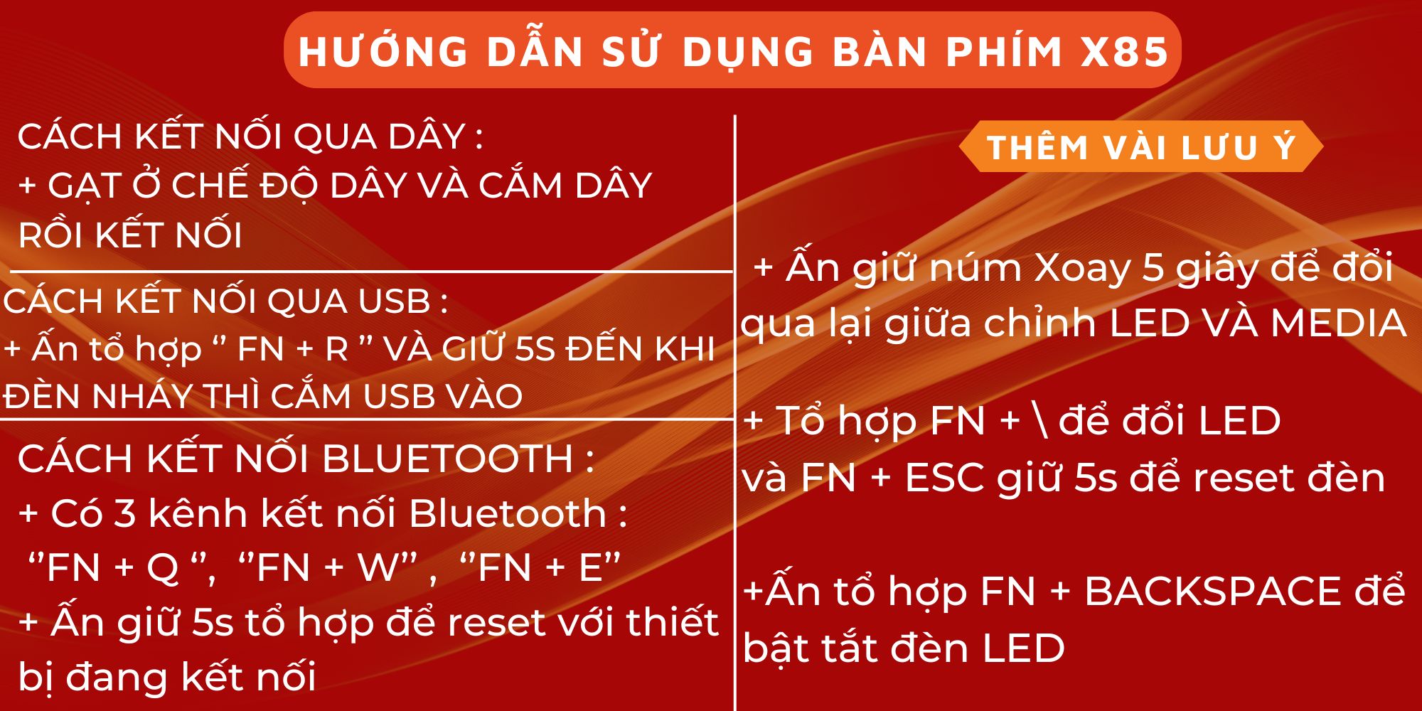 X85 mang đến trải nghiệm kết nối linh hoạt với 3 chế độ qua USB, Wireless 2.4GHz và Bluetooth. Tận hưởng trải nghiệm mượt mà và thời gian phản hồi siêu thấp với kết nối Wireless 2.4GHz, hoặc lựa chọn kết nối Bluetooth tiện lợi mà không cần dongle.