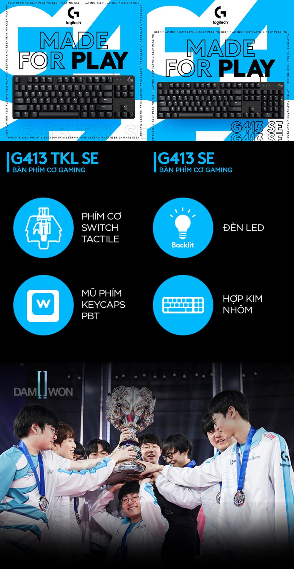 • G413 SE là bàn phím full-size với các tính năng chơi game hàng đầu cùng độ bền và hiệu suất cần thiết để thi đấu