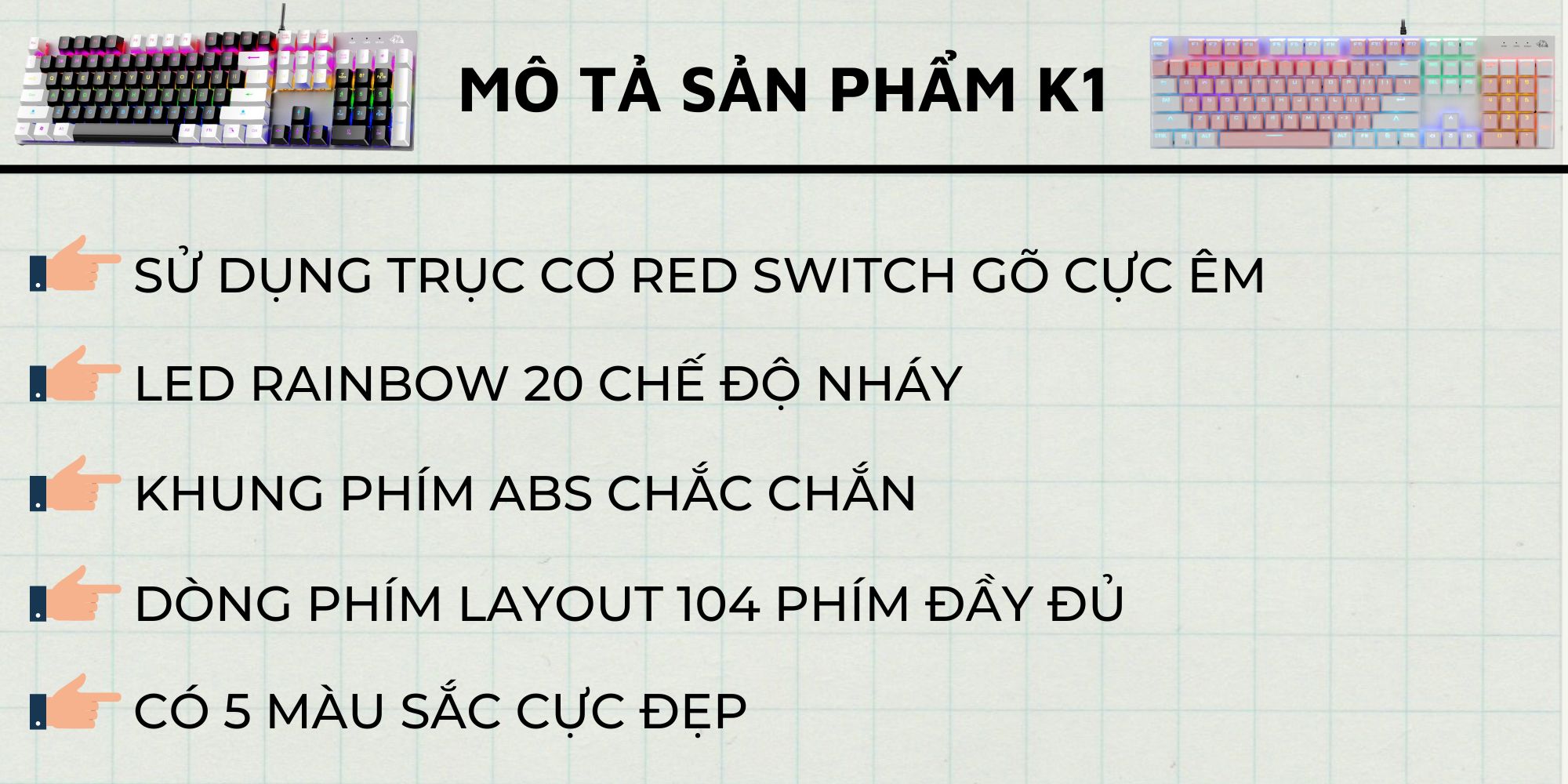 Bàn Phím Cơ Gaming K1 RED Switch 20 Chế Độ LED Màu Cực Đẹp Chơi Mọi Tựa Game Trên Máy Tính Laptop PC