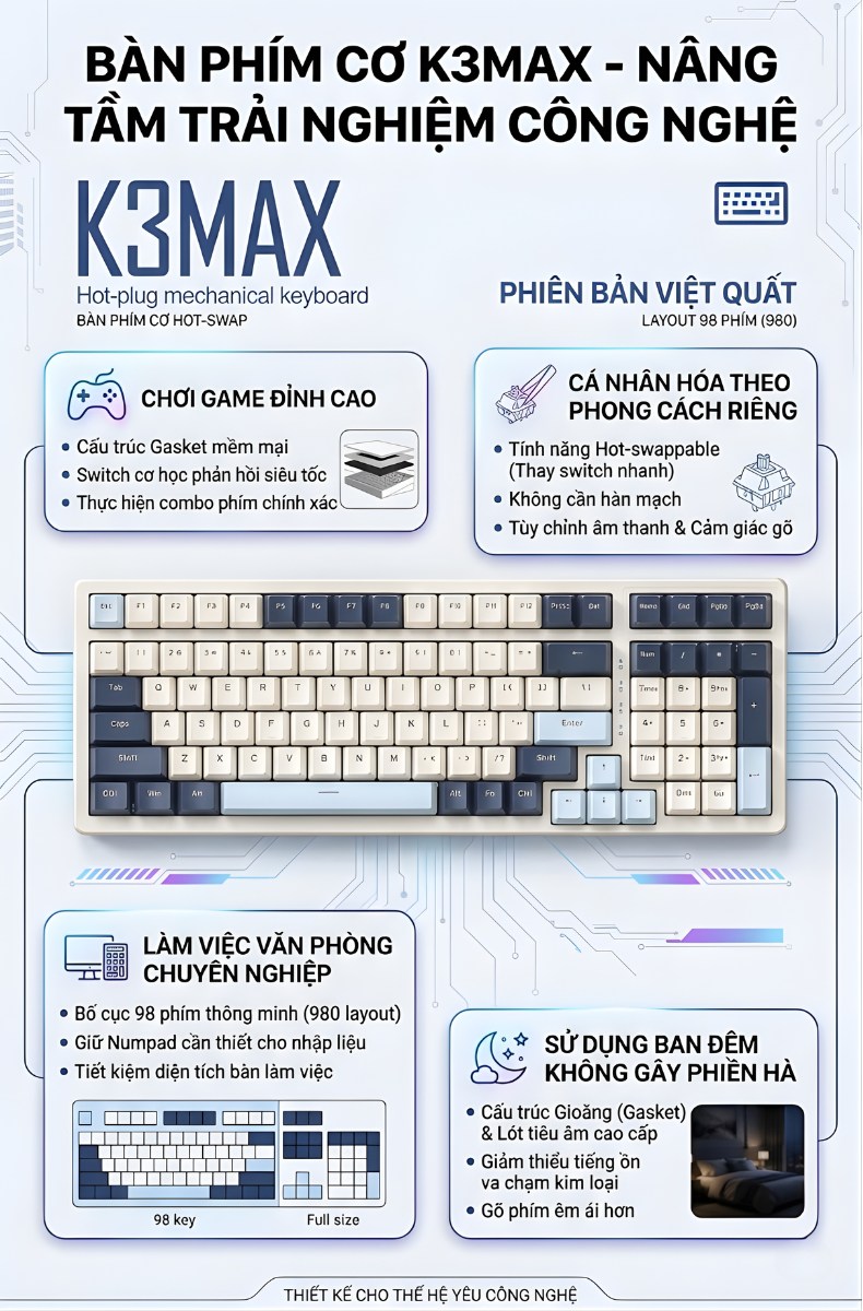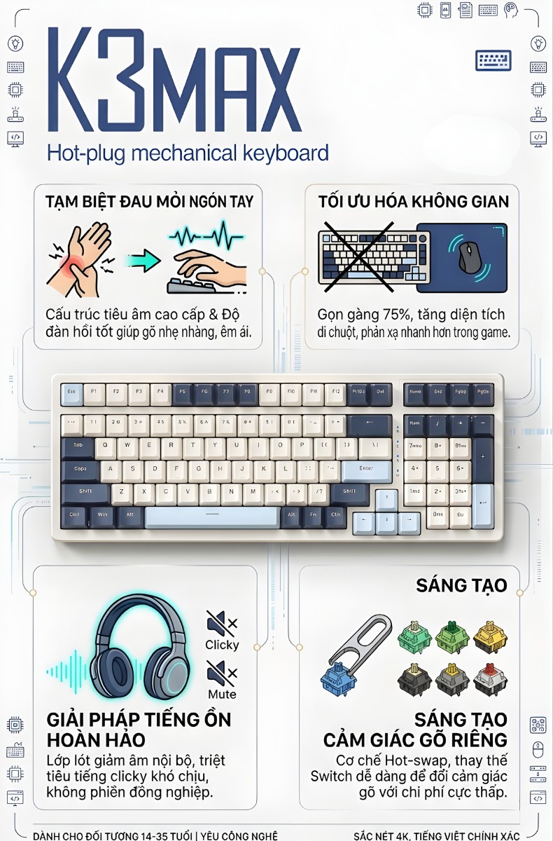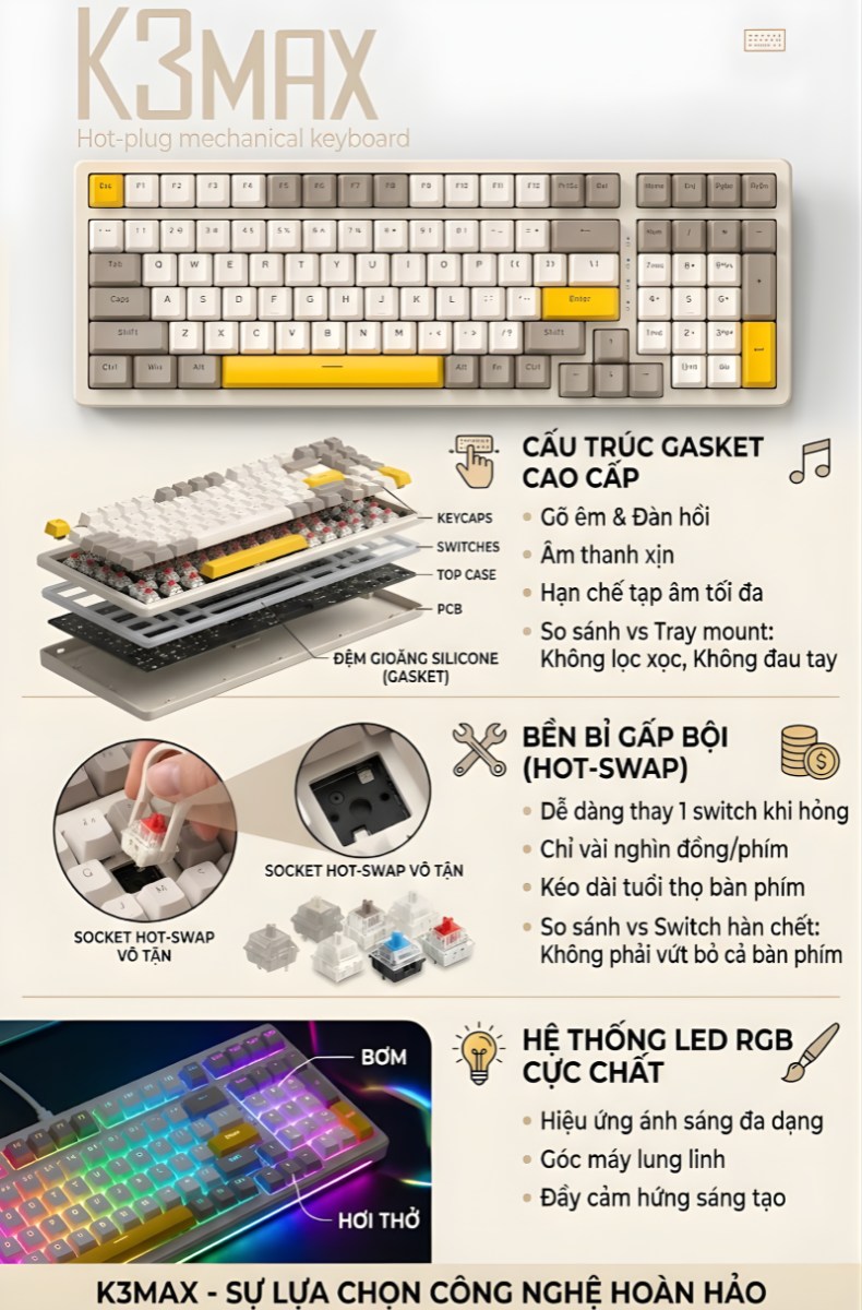 Sản phẩm có hai phiên bản là K3 VÀ K3 MAX: phiên bản K3 MAX được nâng cấp hơn có thêm hai lớp đệm giảm ồn, và được căn chỉnh cho tiếng gõ êm hơn