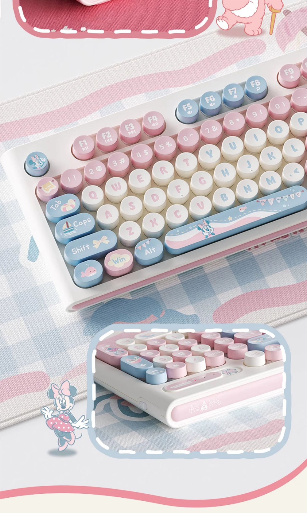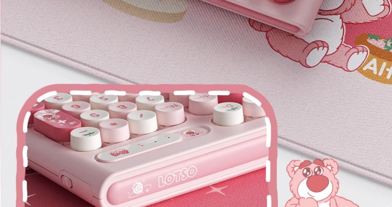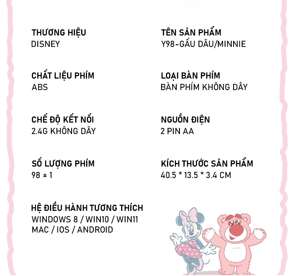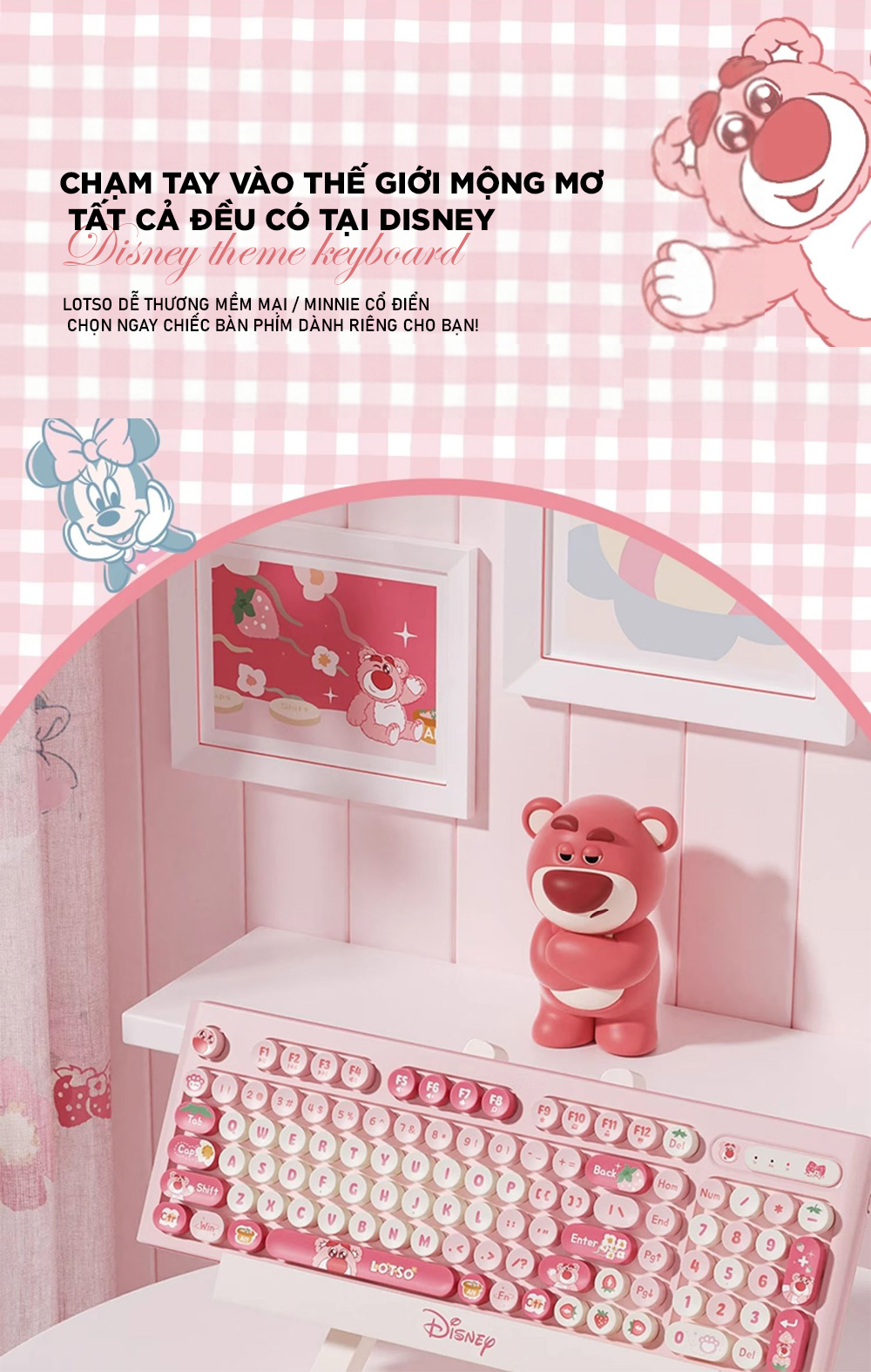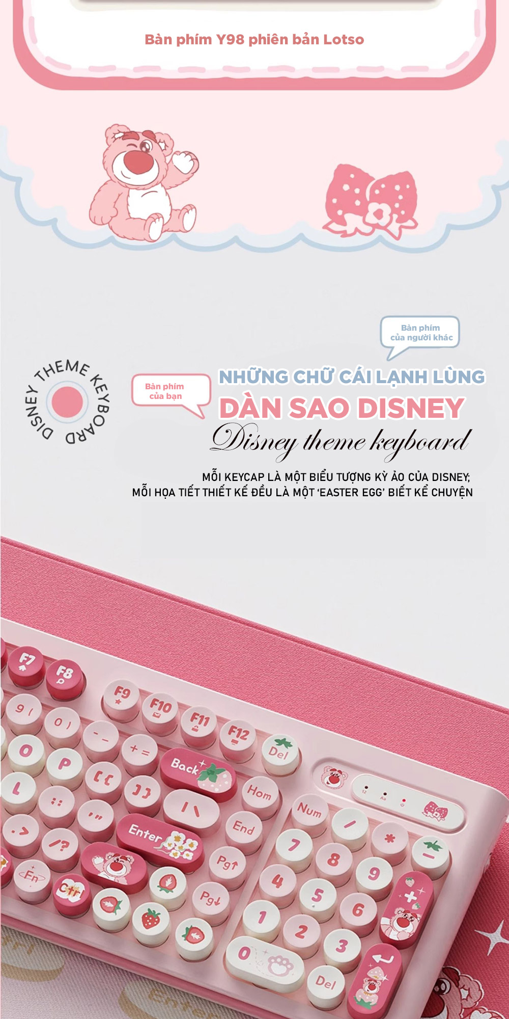 Bàn phím cơ giả không dây Y98 Strawberry Bear Lotso. Bàn phím dễ thương và hoạt động êm ái Kết nối máy tính,laptp