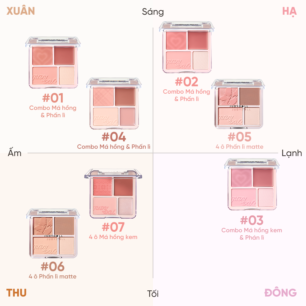 Bảng phấn má hồng bắt sáng JUDYDOLL 4 ô tông lì đa năng mềm mịn trang điểm tự nhiên lâu trôi là sự kết hợp hoàn hảo giữa má hồng, highlight, giúp bạn dễ dàng sáng tạo nhiều phong cách trang điểm khác nhau. Chất phấn mềm mịn, dễ tán, bám lâu trên da mà không gây bí hay khô mốc.