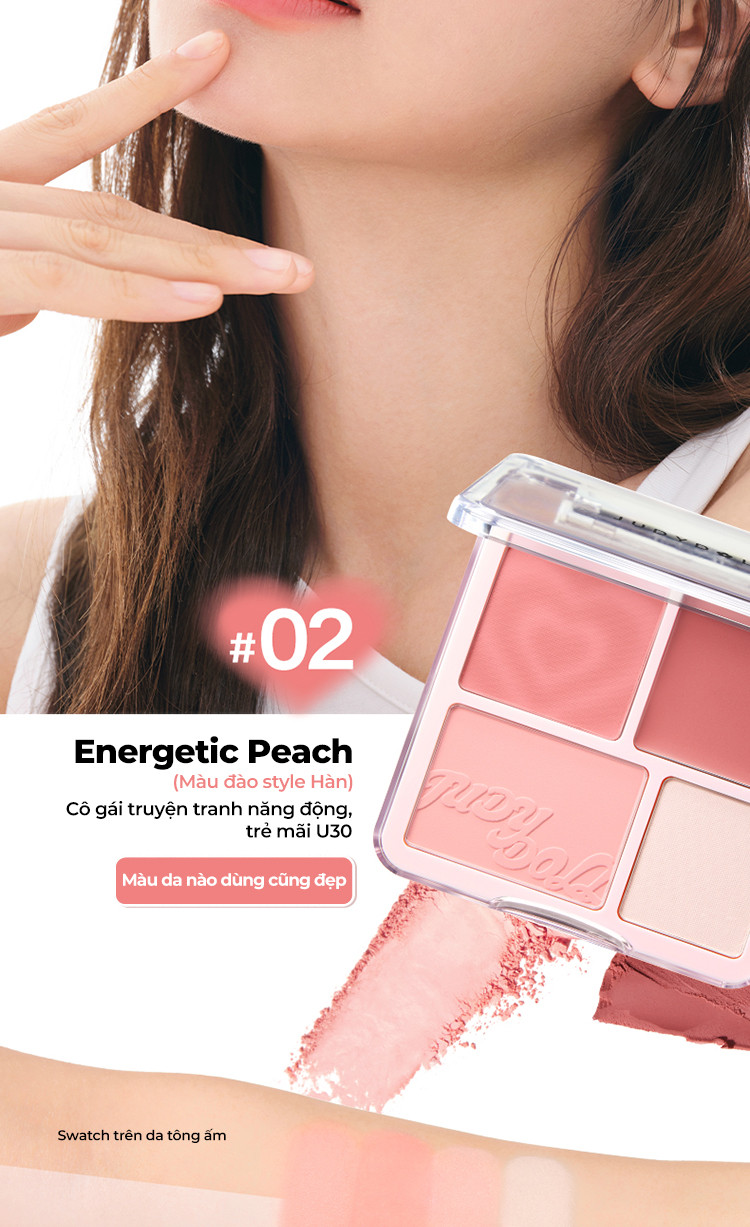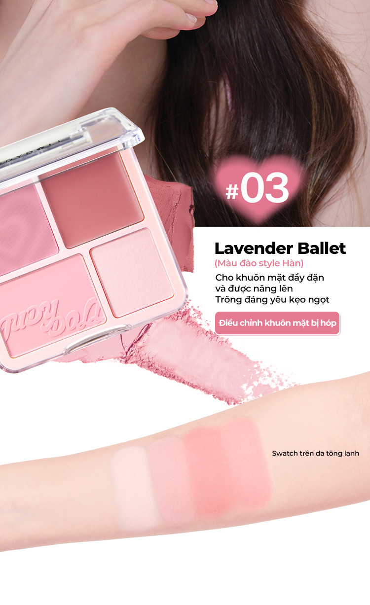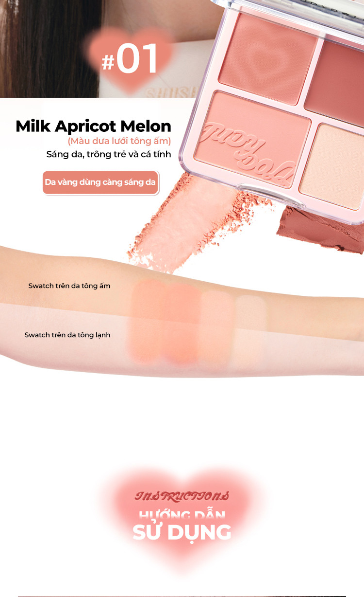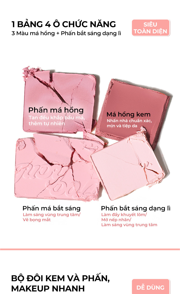 ✔ 4 ô màu đa năng: Kết hợp giữa tông lì và bắt sáng, giúp tạo hiệu ứng má hồng tự nhiên, bắt sáng rạng rỡ và tạo khối nhẹ nhàng.