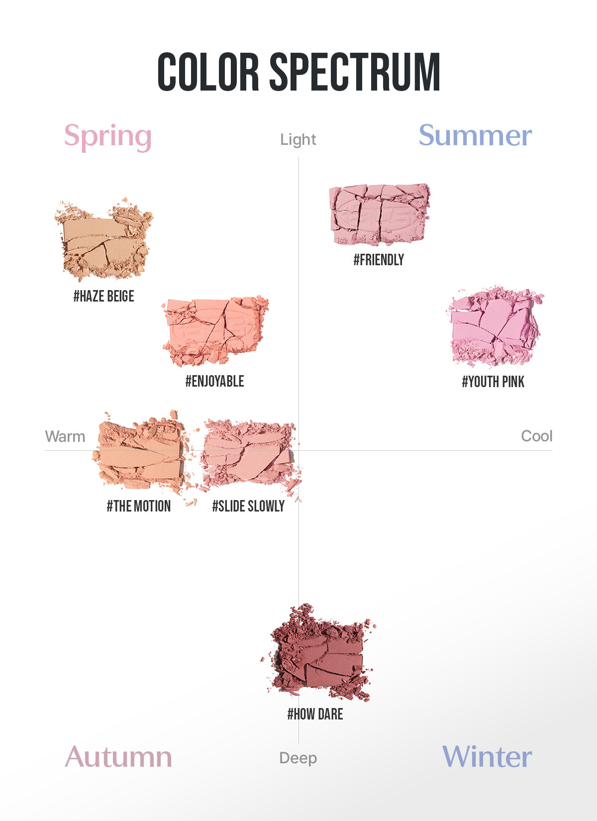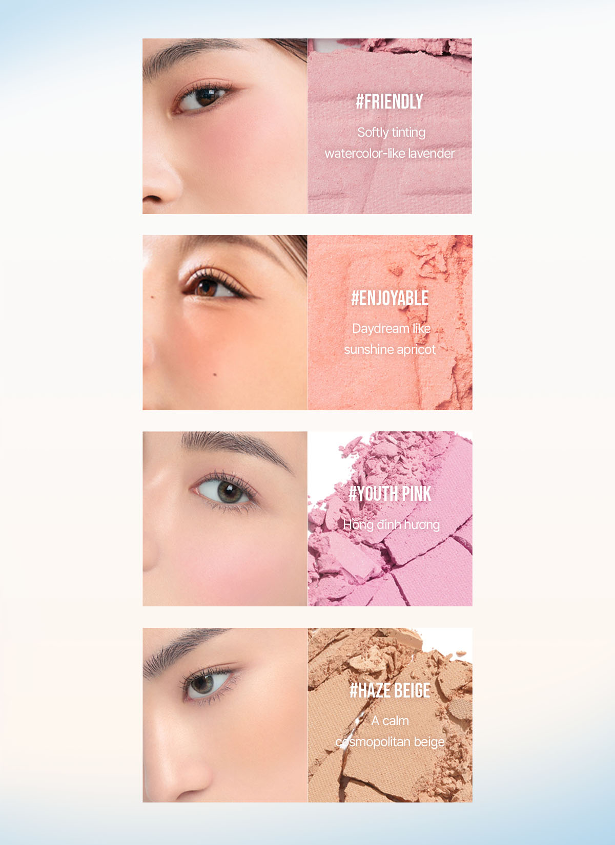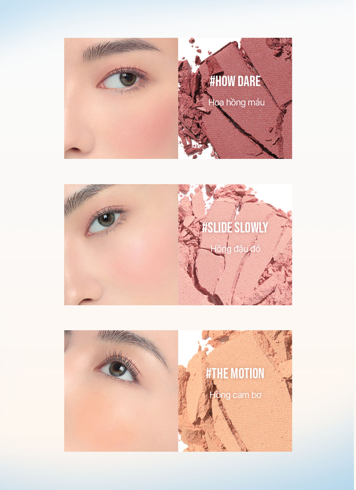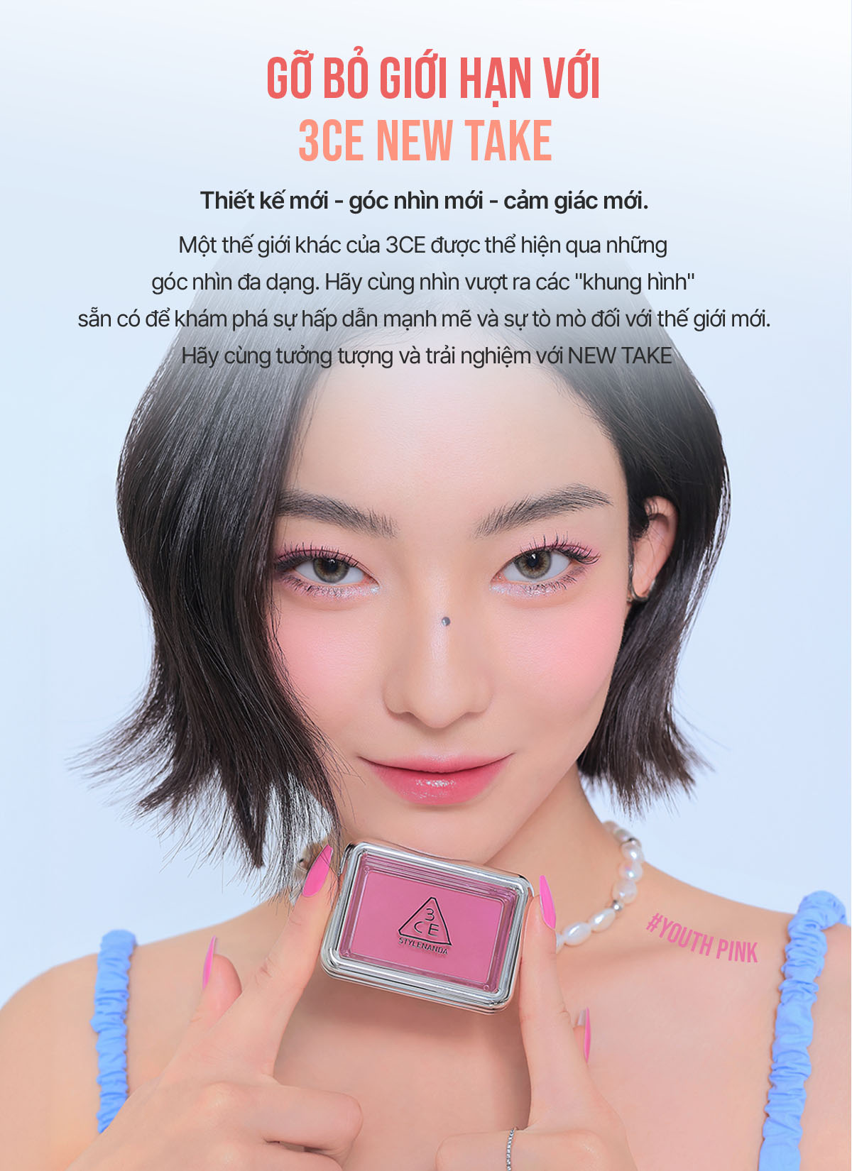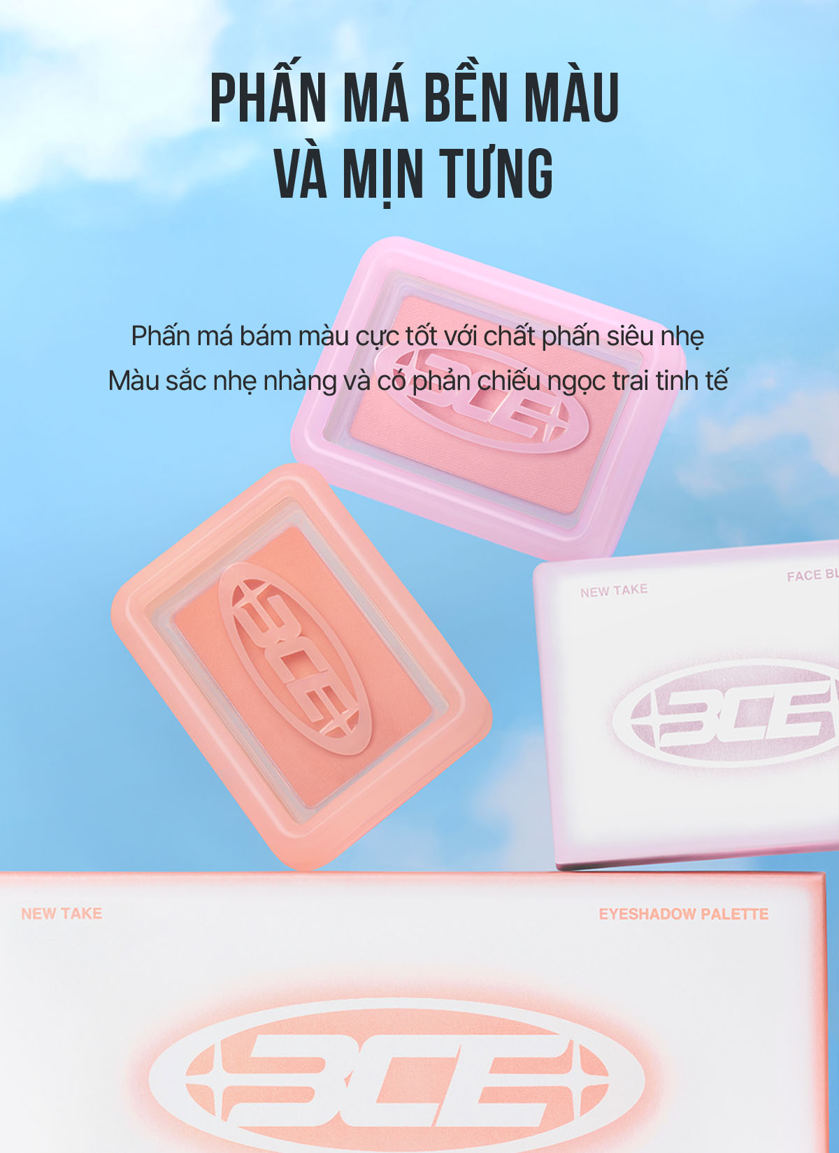 Fan cuồng má hồng đâu rồi, để 3CE dẫn bạn đến một thế giới mới đầy sự tò mò và trí tưởng tượng vô hạn, thông qua BST phấn má hồng New Take lần này. Với lần ra mắt này, má hồng 3CE sẽ mang đến một cách cảm nhận và thưởng thức mới cho phái đẹp. Phấn má tô điểm cho gương mặt thêm tươi tắn thông qua các màu sắc nhẹ nhàng và tươi sáng qua các lớp mỏng. Ngoài ra, chất phấn có "ánh" một chút ngọc trai, qua đó "em nó" giúp hai bên má của chị em thêm phần nổi bật và tinh tế.A. Màu sắc tự nhiên và phản chiếu ngọc trai tinh tế