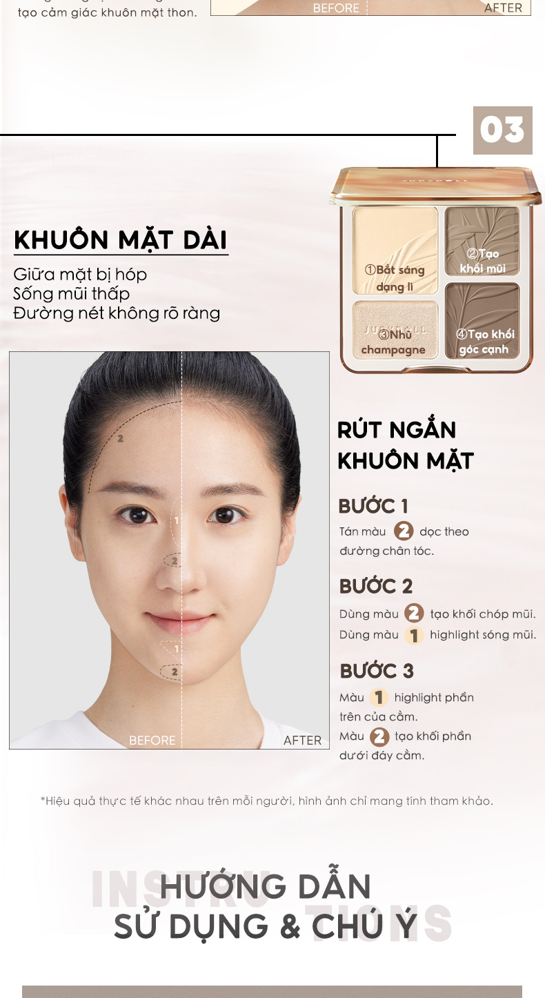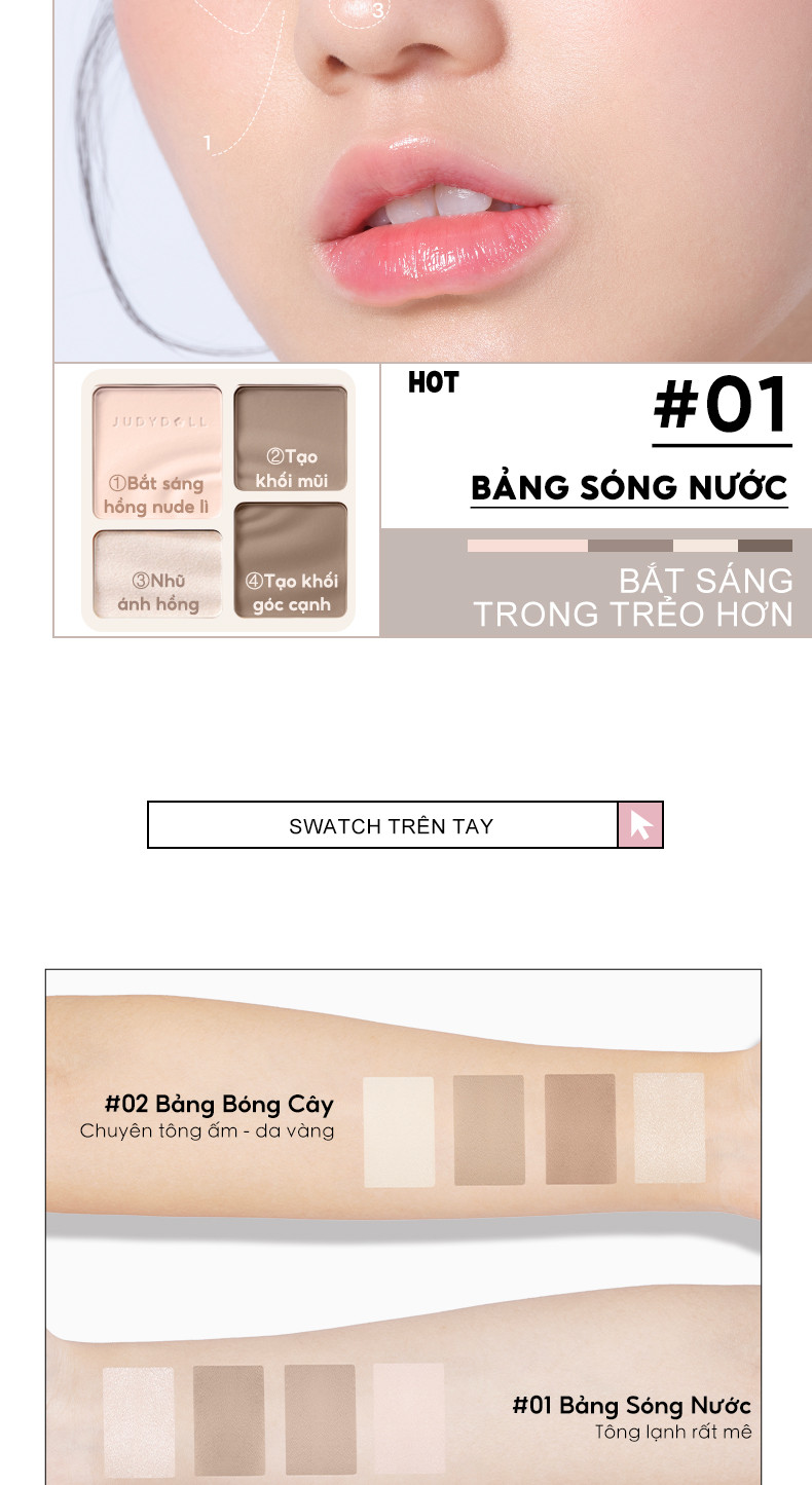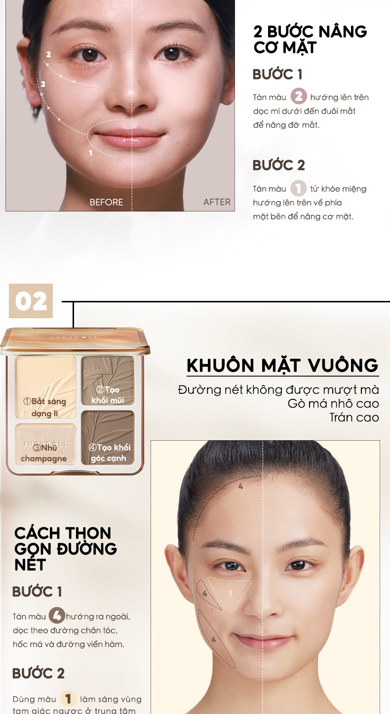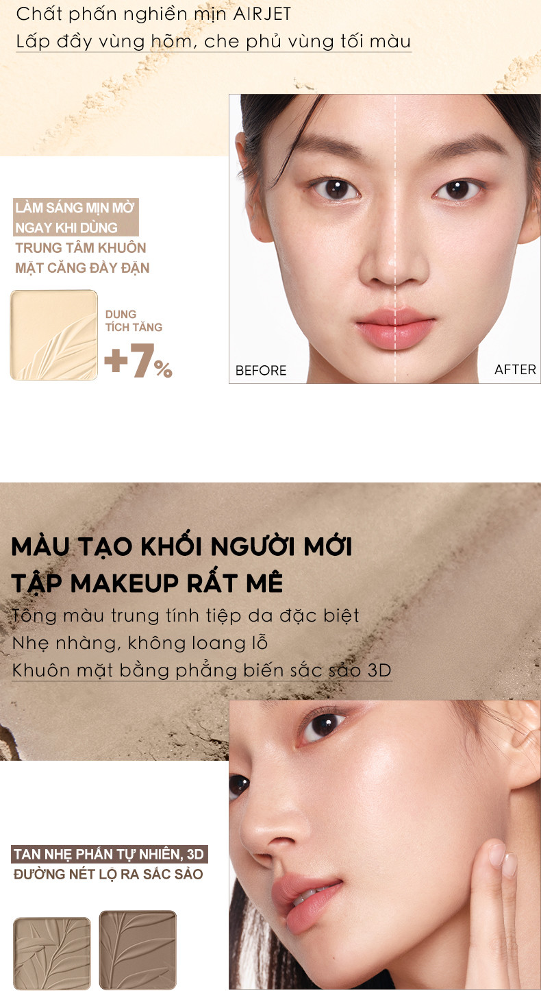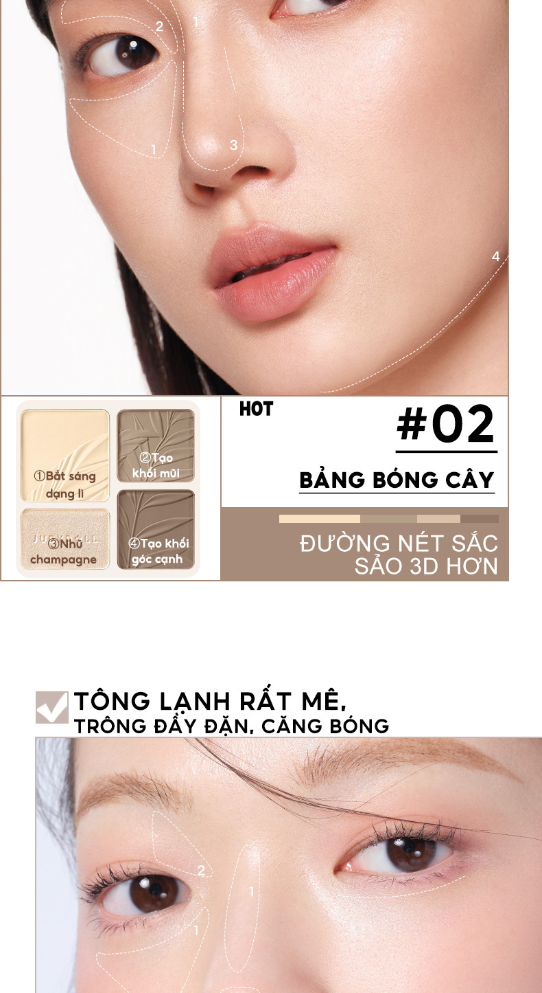 ✔ 2in1 tiện lợi: Kết hợp cả phấn bắt sáng (highlight) và phấn tạo khối (contour) trong cùng một bảng, giúp tiết kiệm thời gian trang điểm.