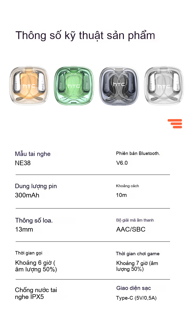 Bảo hành một năm HTC NE38 AI Dịch thuật thời gian thực Tai nghe BluetoothTWS Bluetooth 6.0 Chất lượng âm thanh HiFi IPX5 Tai nghe không dây chống nước