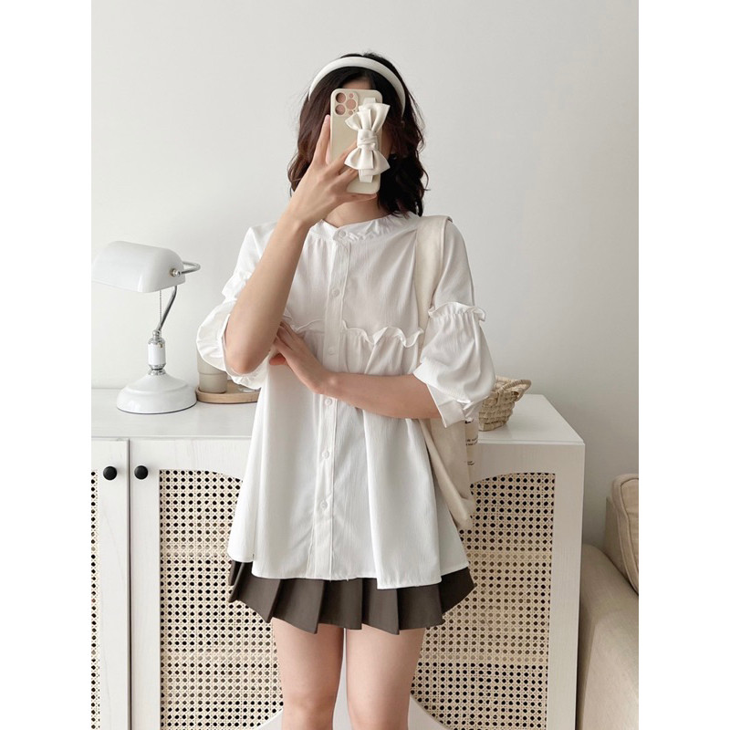 BARE_Áo kiểu babydoll tay ngắn phối bèo thiết kế tay phồng cổ trụ thời trang hàn quốc sang trọng- A199