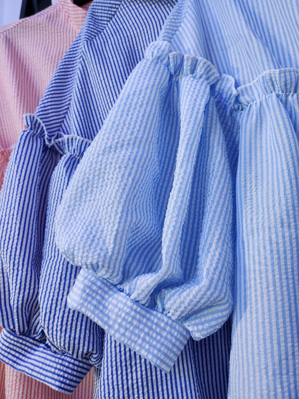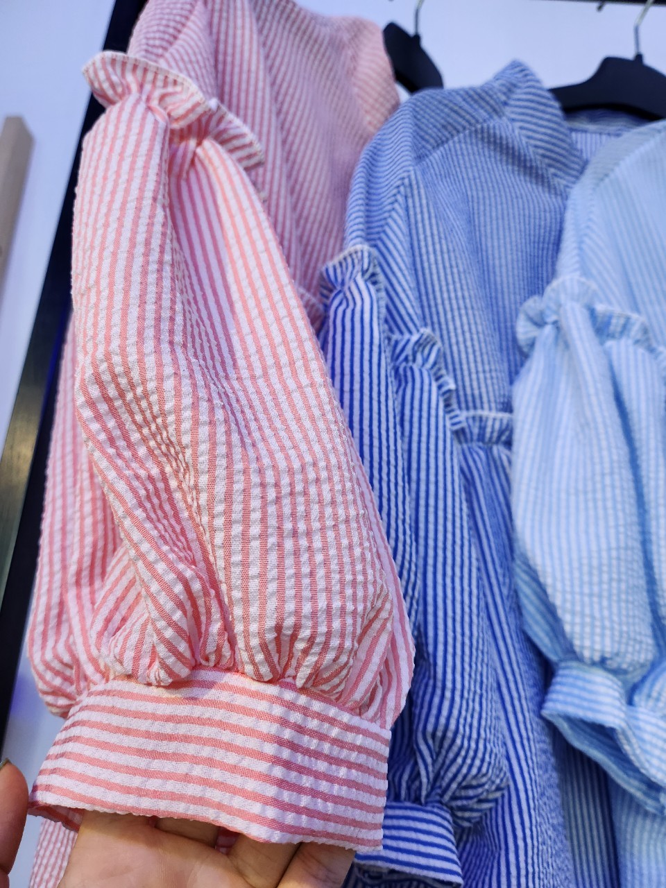 - Kiểu dáng: Thiết kế áo tay phồng rộng che khuyết điểm, Cổ trụ sơ mi thanh lịch