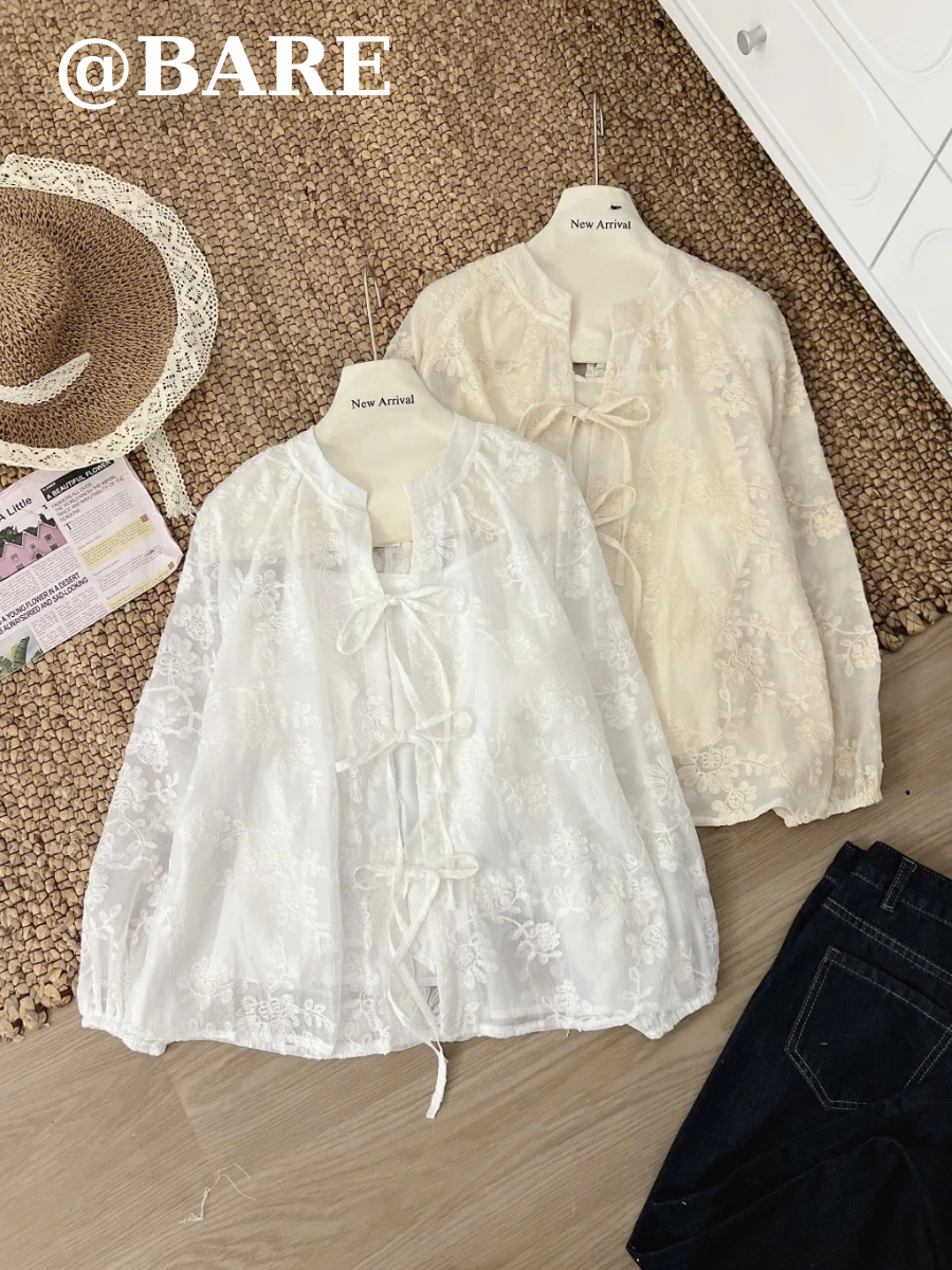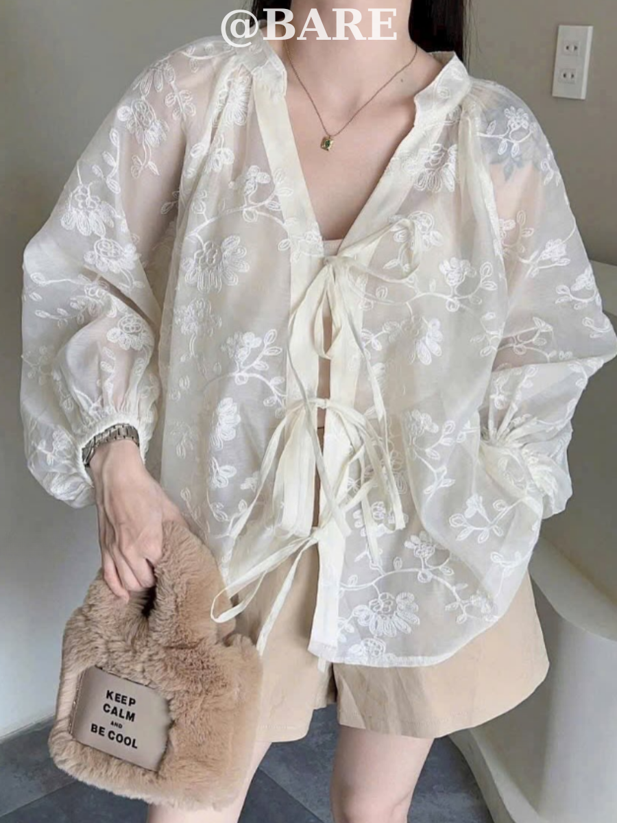 Bare_Áo Sơ Mi Thiết Kế, Vải Voan Thêu Xuyên Thấu Dây Buộc Nơ Gợi Cảm (Tặng Kèm Áo Thun Hai Dây)_A518