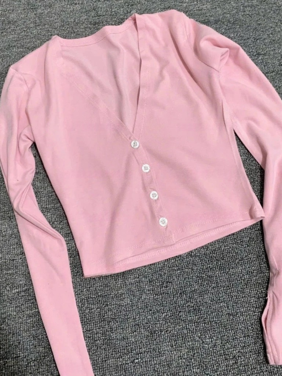Áo cardigan croptop dài tay cổ V nhẹ – thiết kế nút lệch độc đáo, vải thun mịn mát co giãn, ôm body vừa phải, giúp tôn dáng và tạo hiệu ứng eo thon.