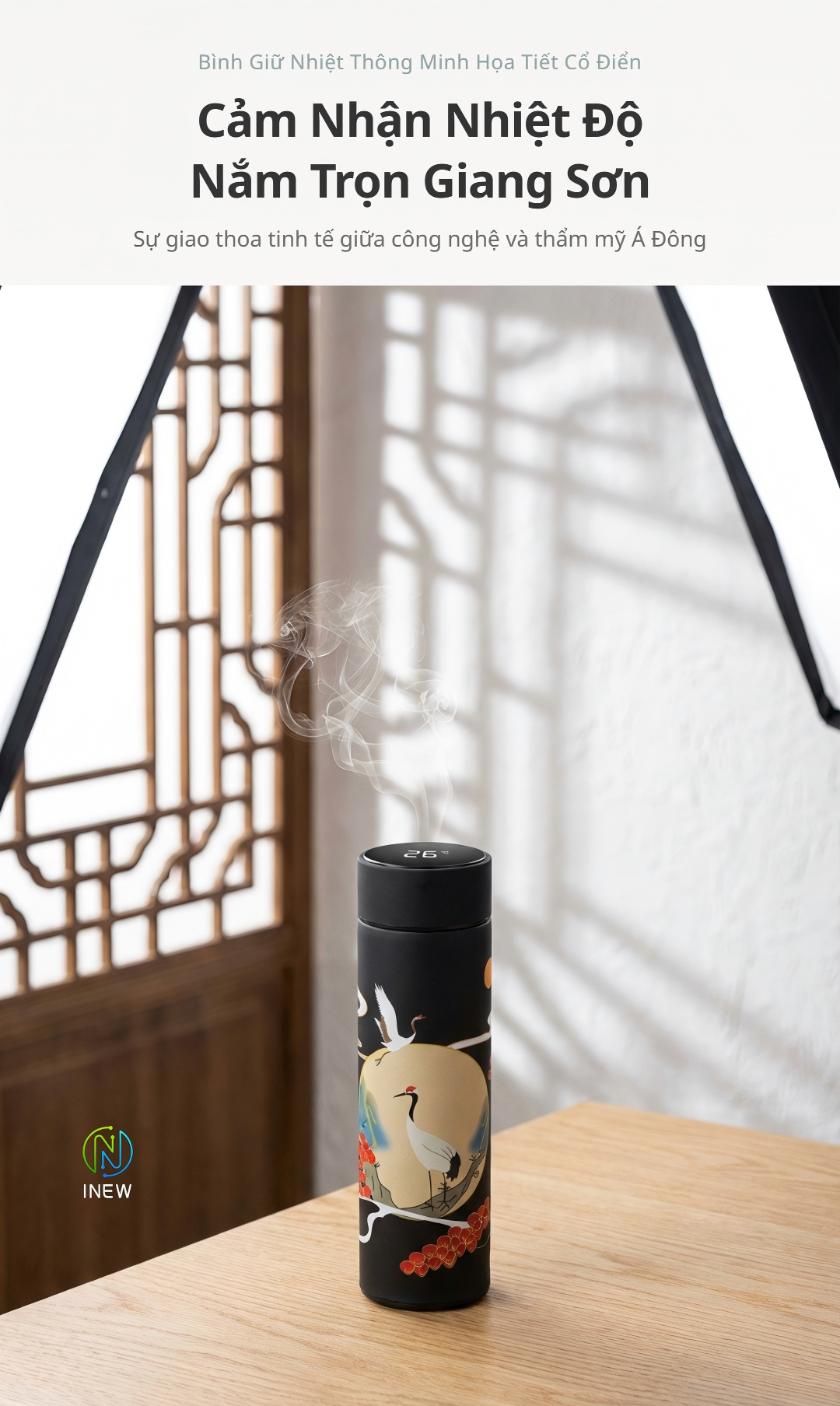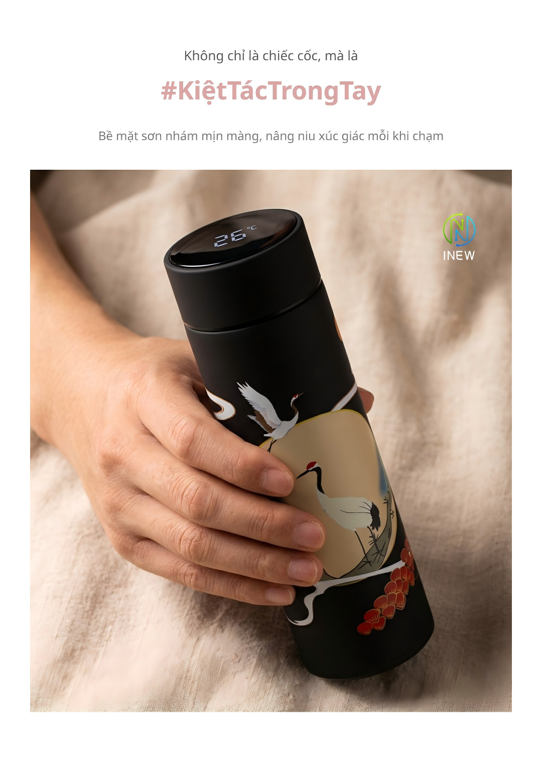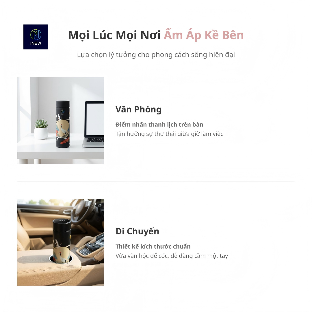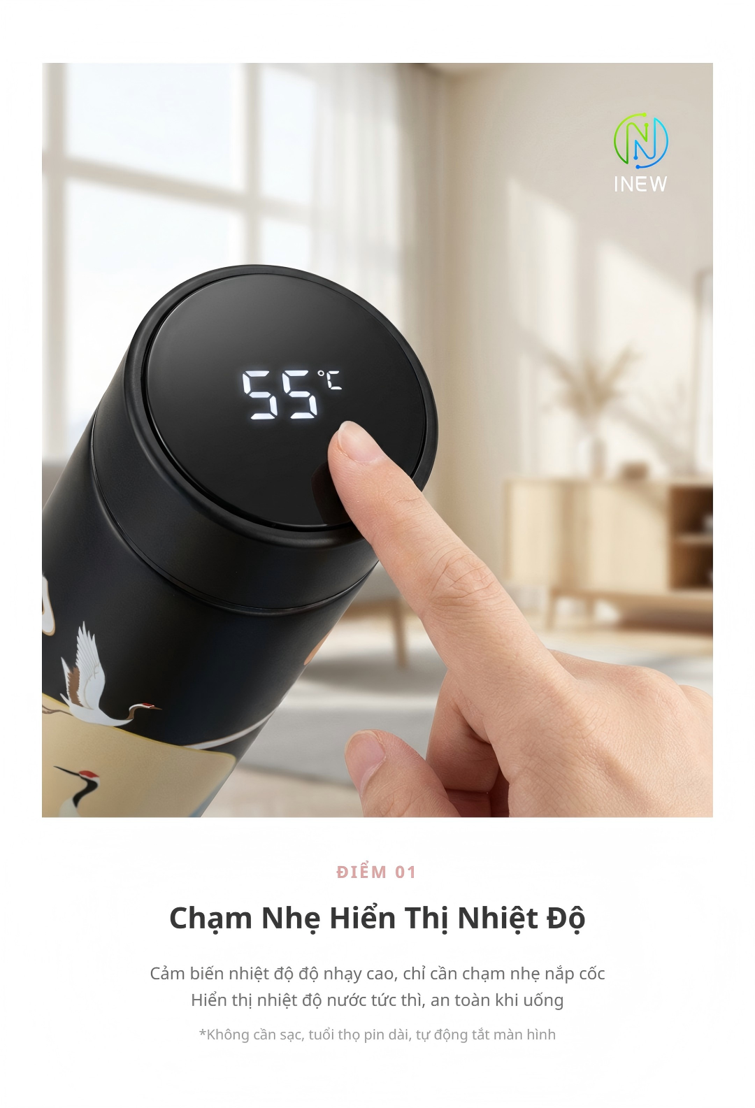 Bình giữ nhiệt inox thông minh hiển thị nhiệt độ, dạng thẳng dùng trên xe, dày hơn