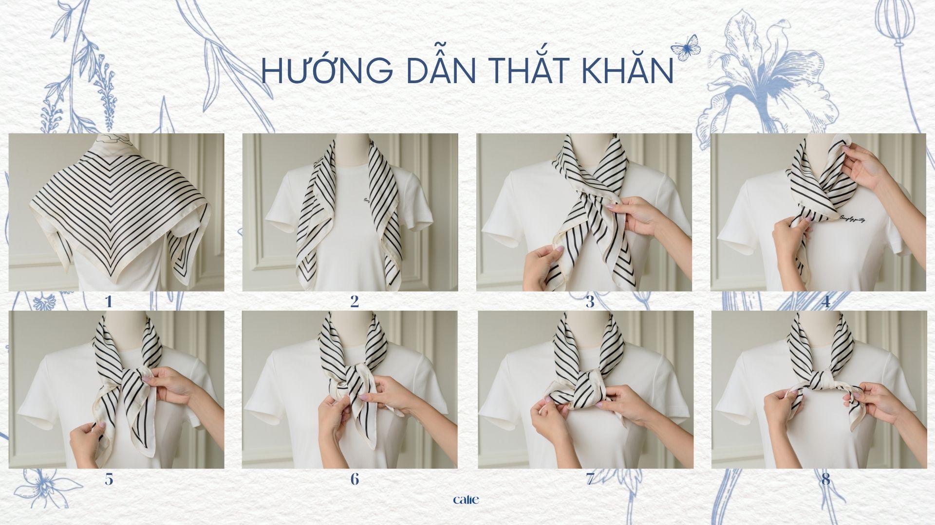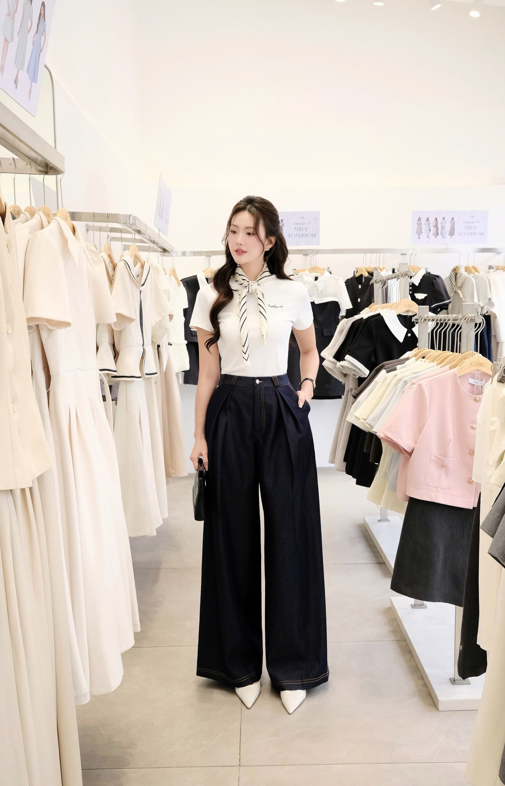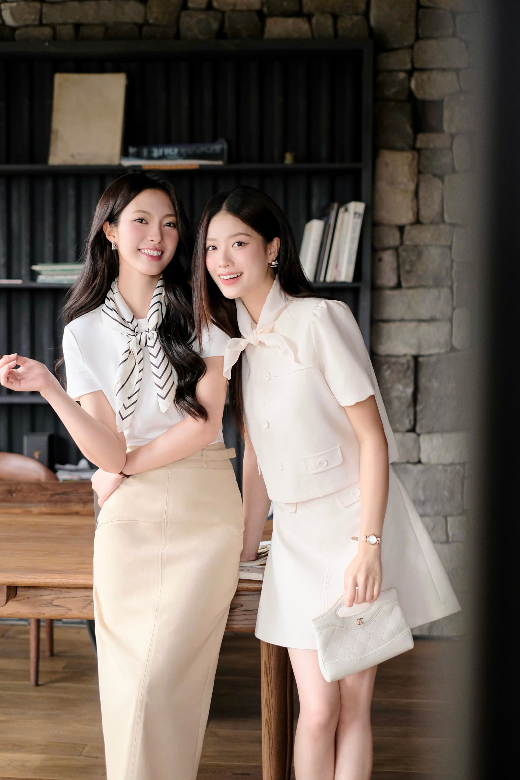 (Blue to Bloom) Áo cotton cổ tròn kèm khăn thêu logo, Chân váy chất kaki dáng xòe kèm belt Calie Af169, Cx065