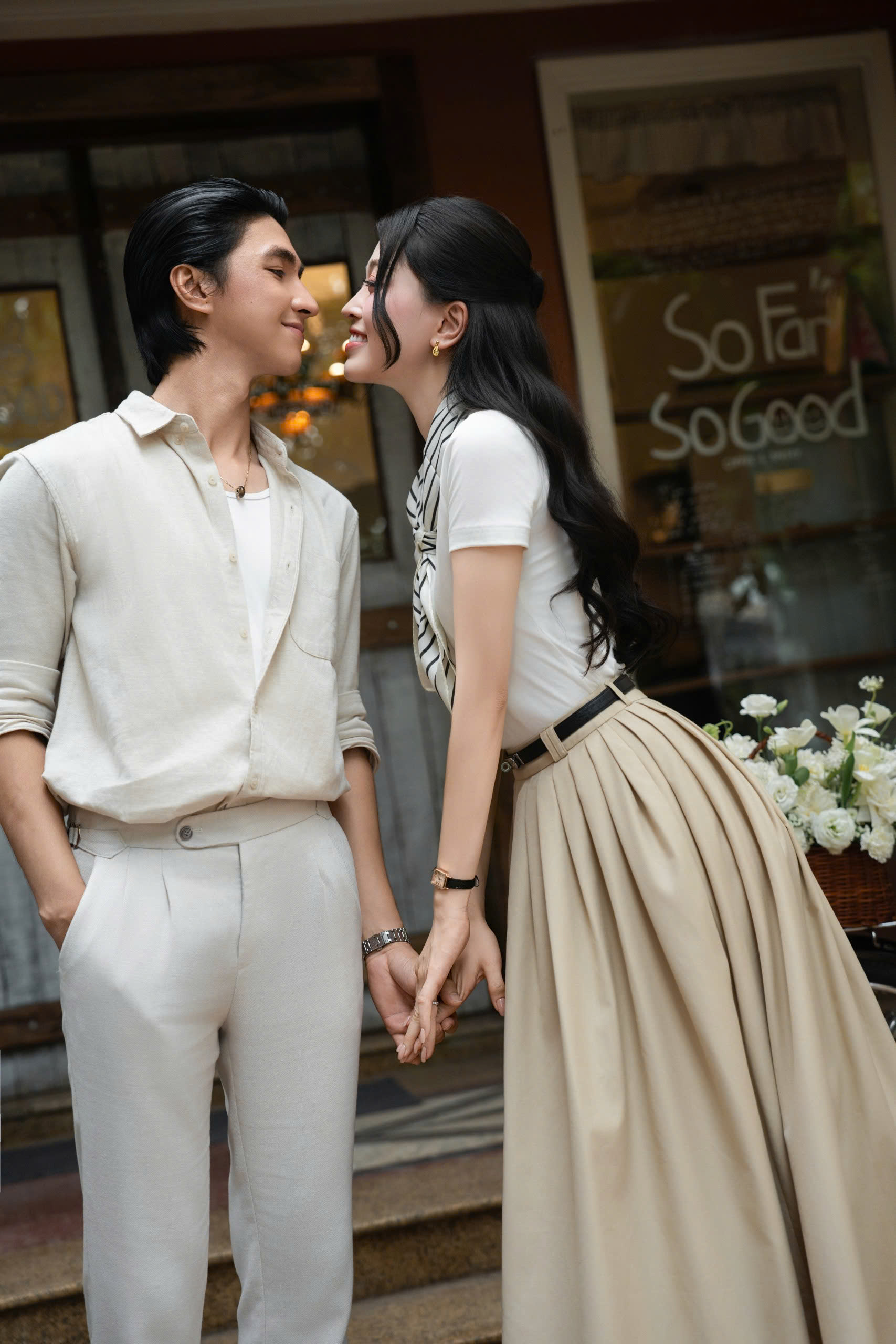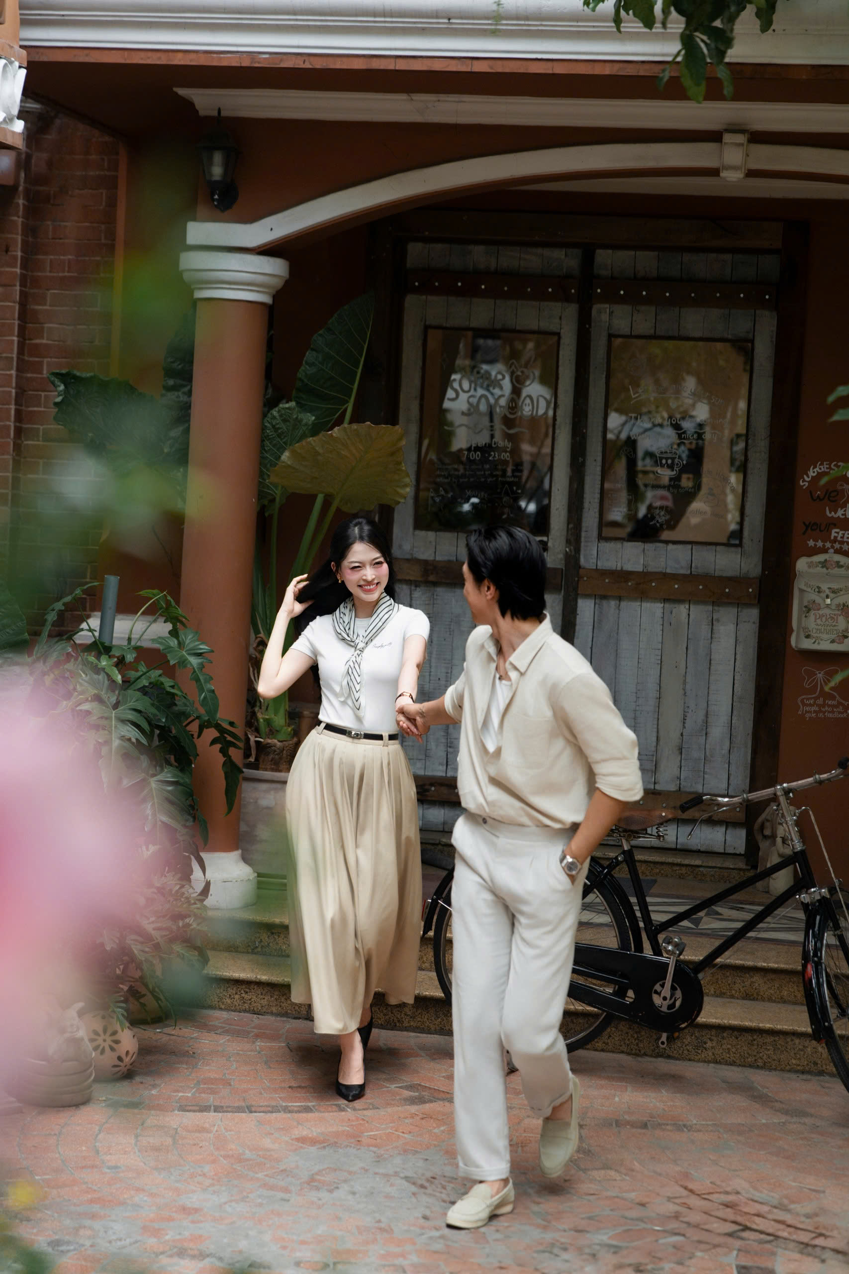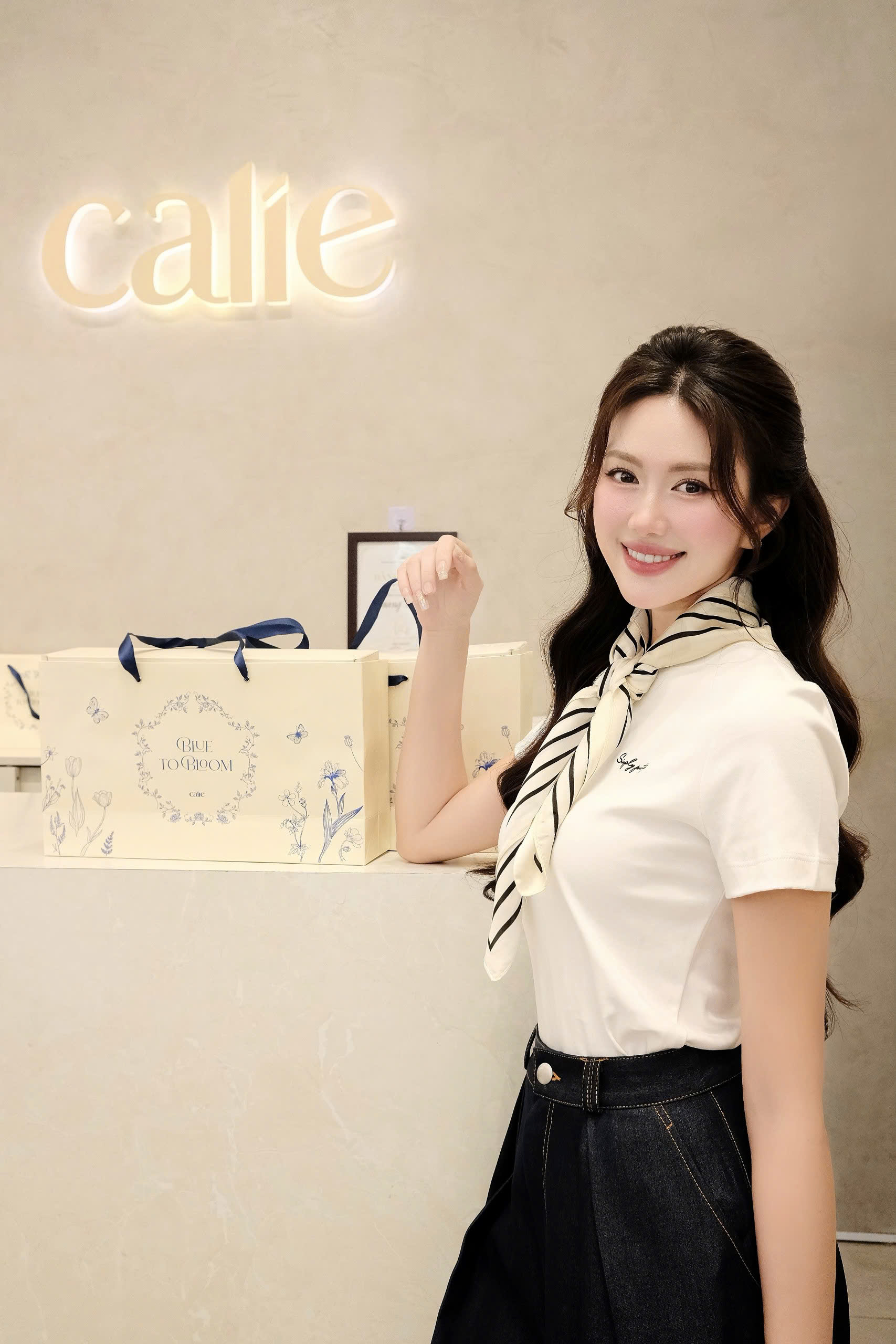 (Blue to Bloom) Áo cotton cổ tròn kèm khăn thêu logo, Chân váy chất kaki dáng xòe kèm belt Calie Af169, Cx065