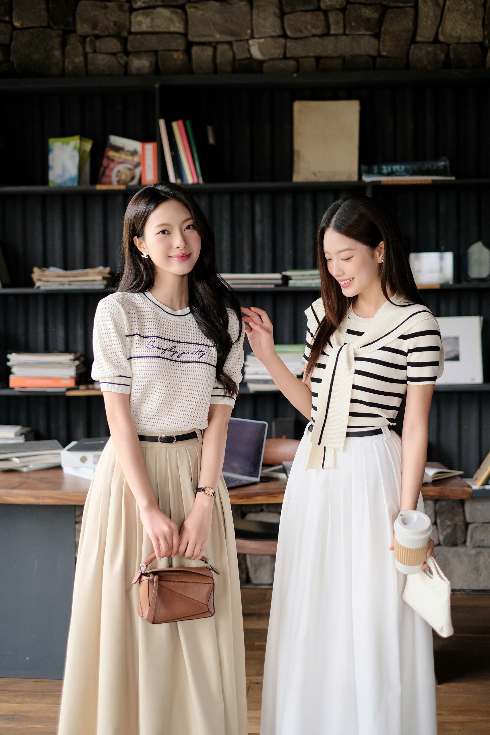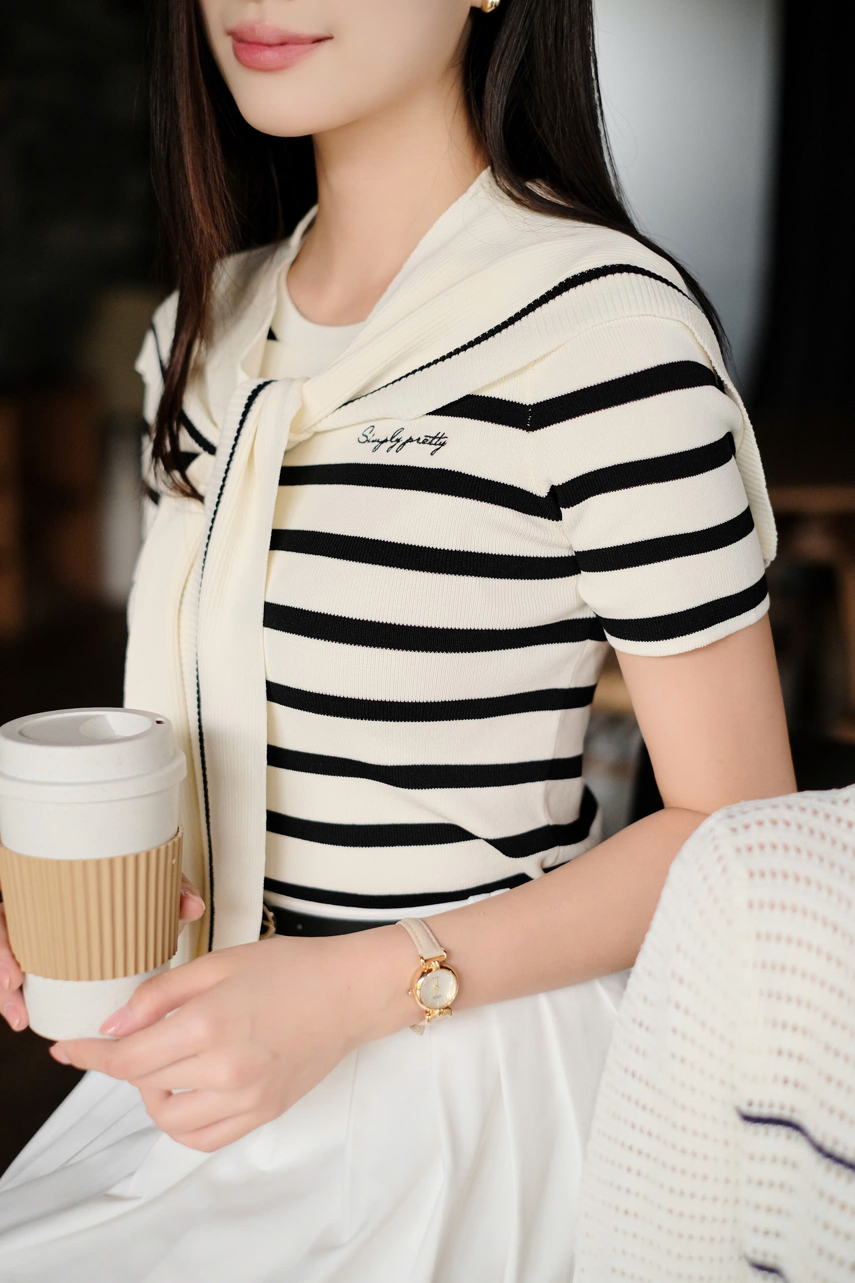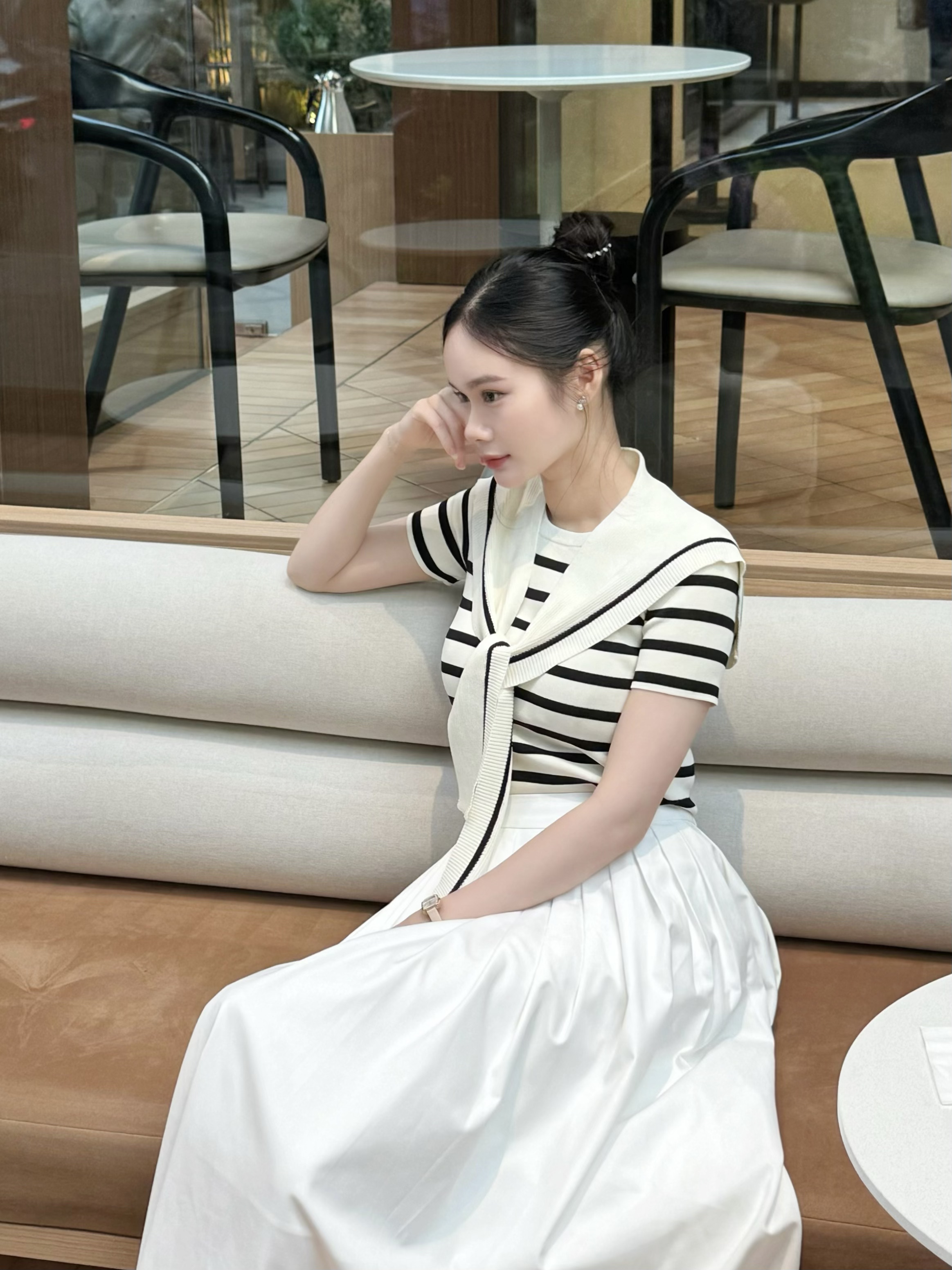 (Blue to Bloom) Áo dệt kim kẻ kèm khăn thêu logo, chất liệu cao cấp, mềm mát thời trang thiết kế Calie AF167 - CX065