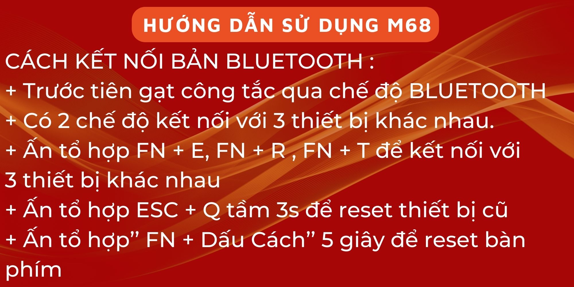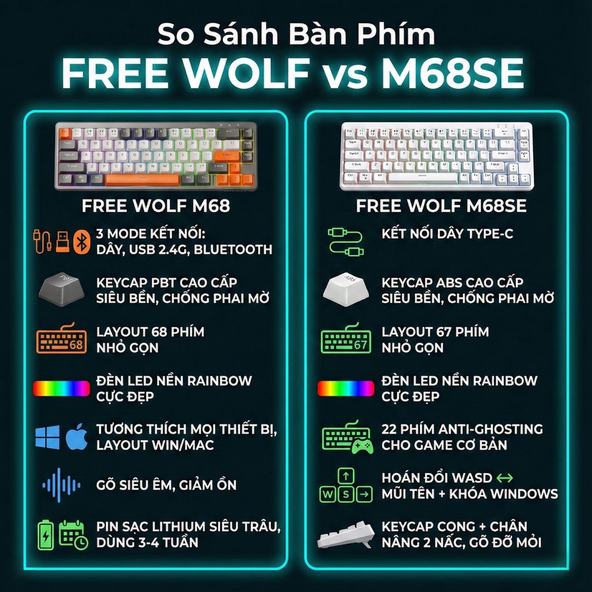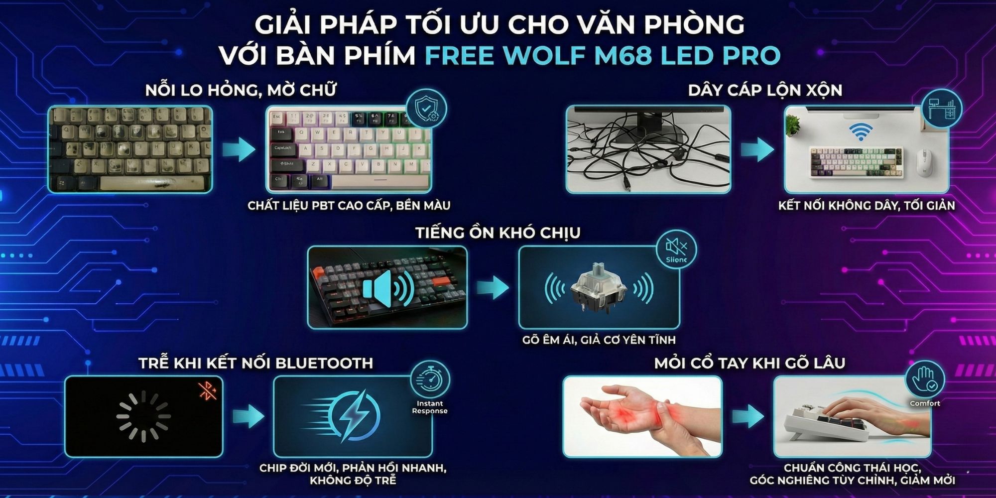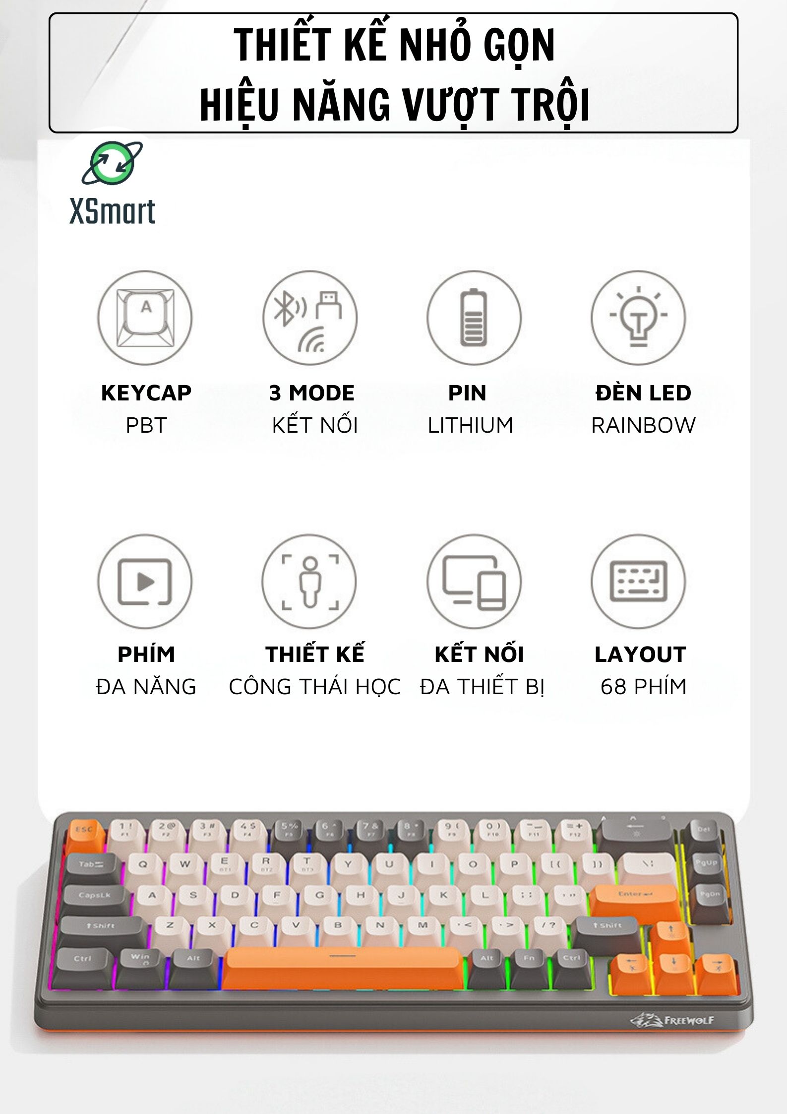 Bàn phím Bluetooth FreeWolf M68 là sự kết hợp hoàn hảo giữa thiết kế, hiệu năng và tính tiện dụng. Sở hữu ngay để trải nghiệm sự khác biệt!