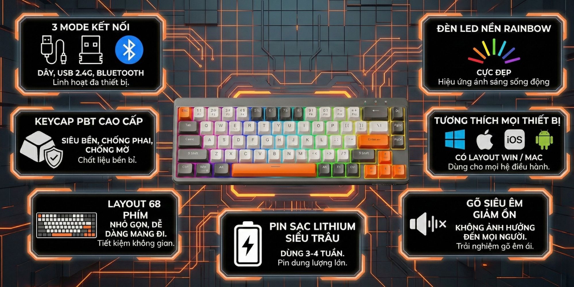 Chất liệu PBT cao cấp: Bền bỉ, chống mài mòn, chịu nhiệt tốt, cho cảm giác gõ phím tuyệt vời.