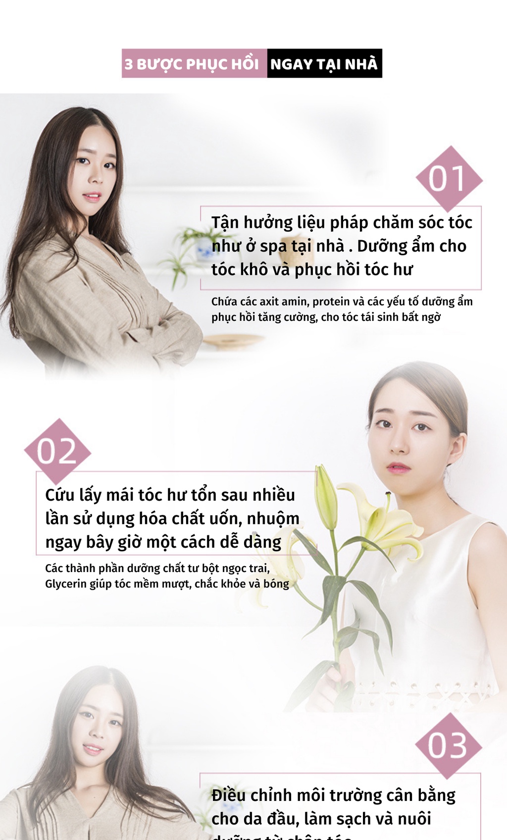 Phục hồi tóc hư tổn, tóc khô, chẻ ngọn,... đặc biệt là tóc dùng nhiều hóa chất
