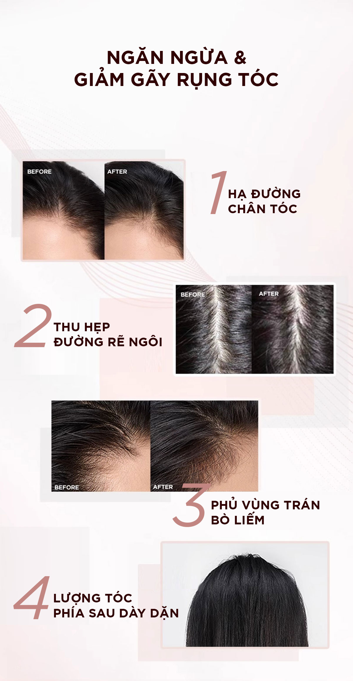 - Làm chắc khỏe và phục hồi tóc, ngăn ngừa & giảm gãy rụng tóc