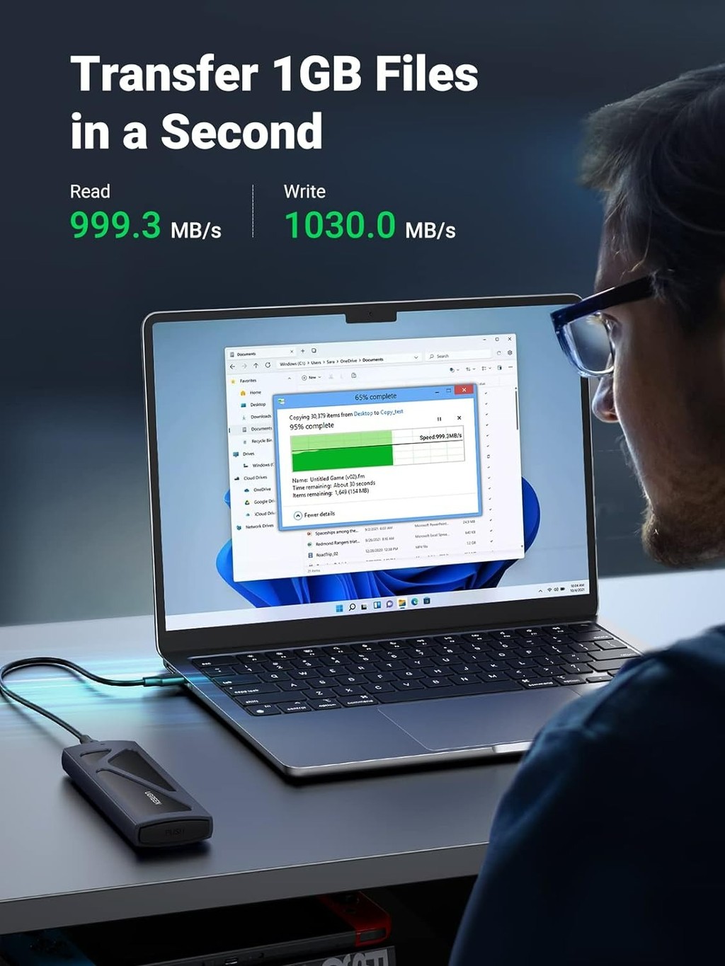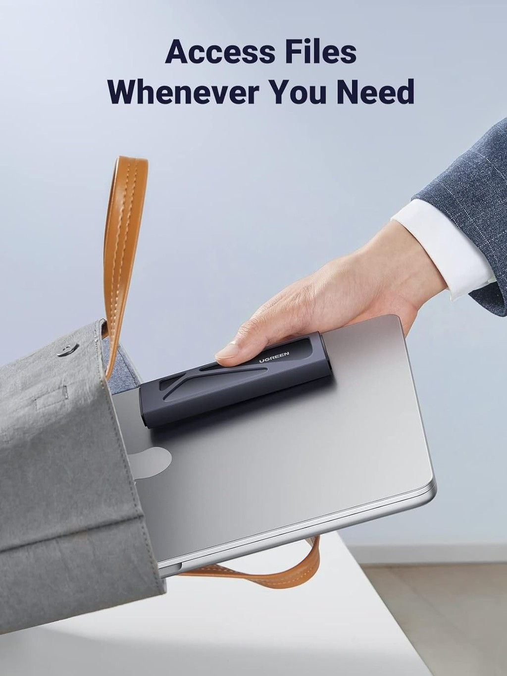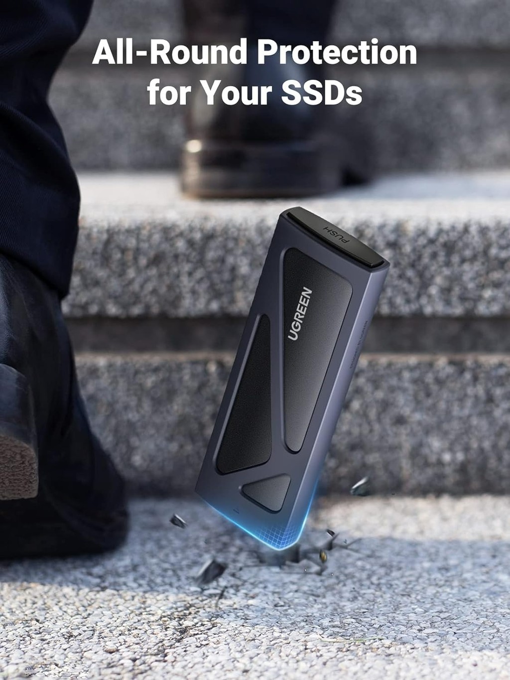 - Không cần công cụ: Cắm và chạy, không cần driver. Vỏ ngoài có nút ấn, có thể mở mà không cần bất kỳ dụng cụ nào và SSD được lắp thông qua giá đỡ trượt; một vít cao su bên trong có thể được di chuyển theo chiều dài chính xác của SSD mà vẫn ổn định để đạt có chức năng cố định