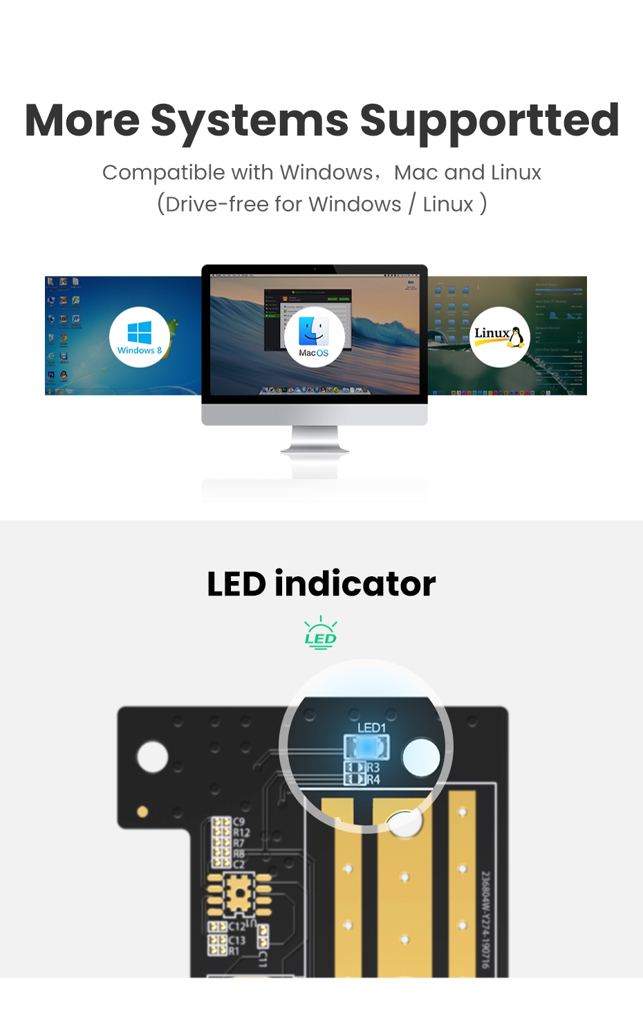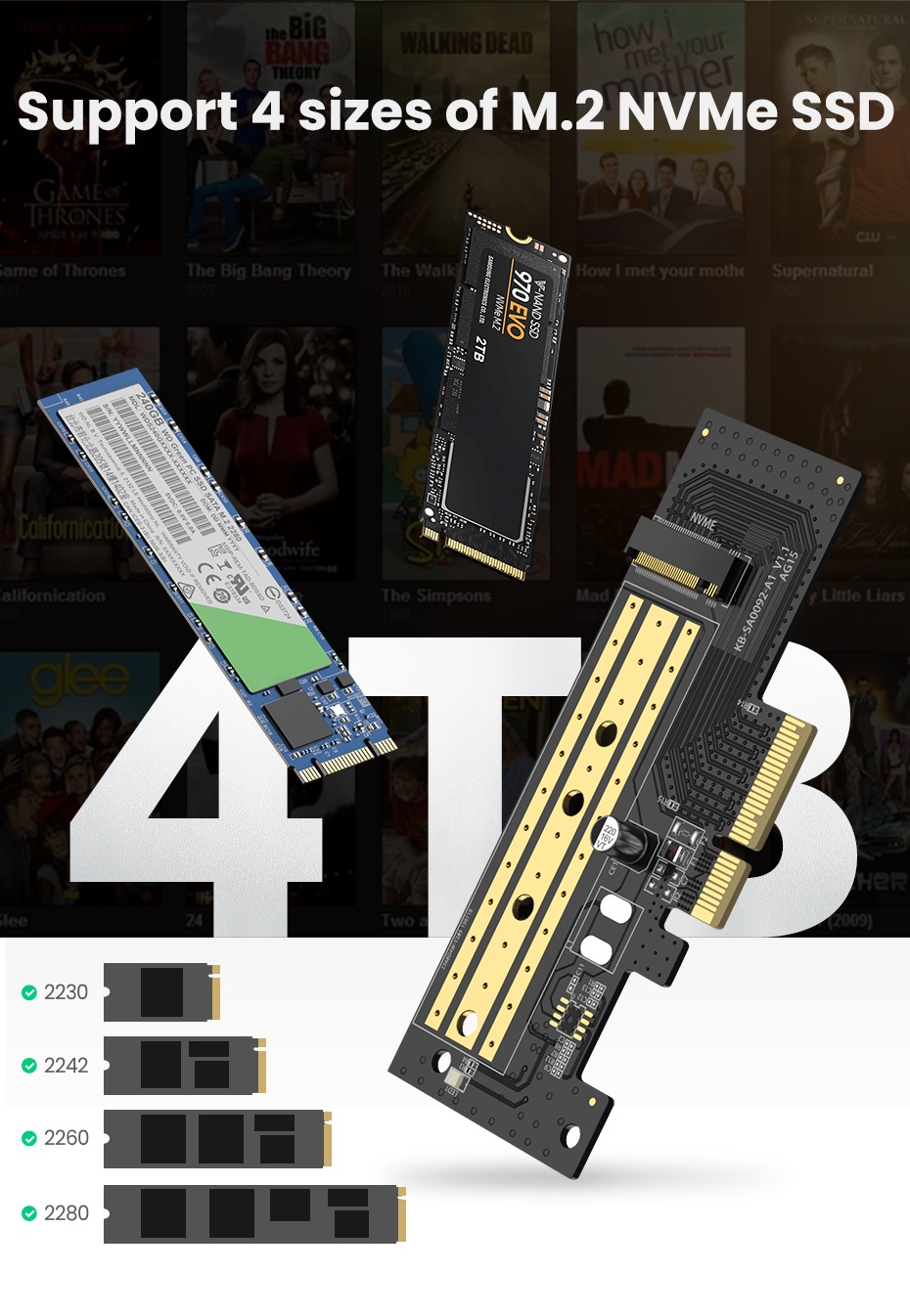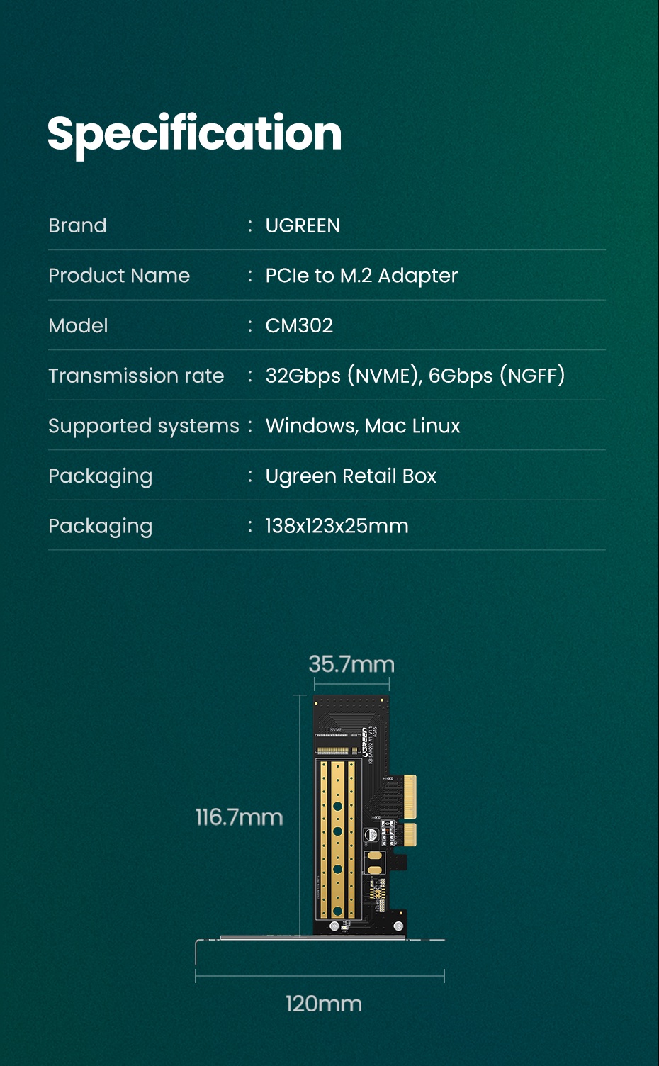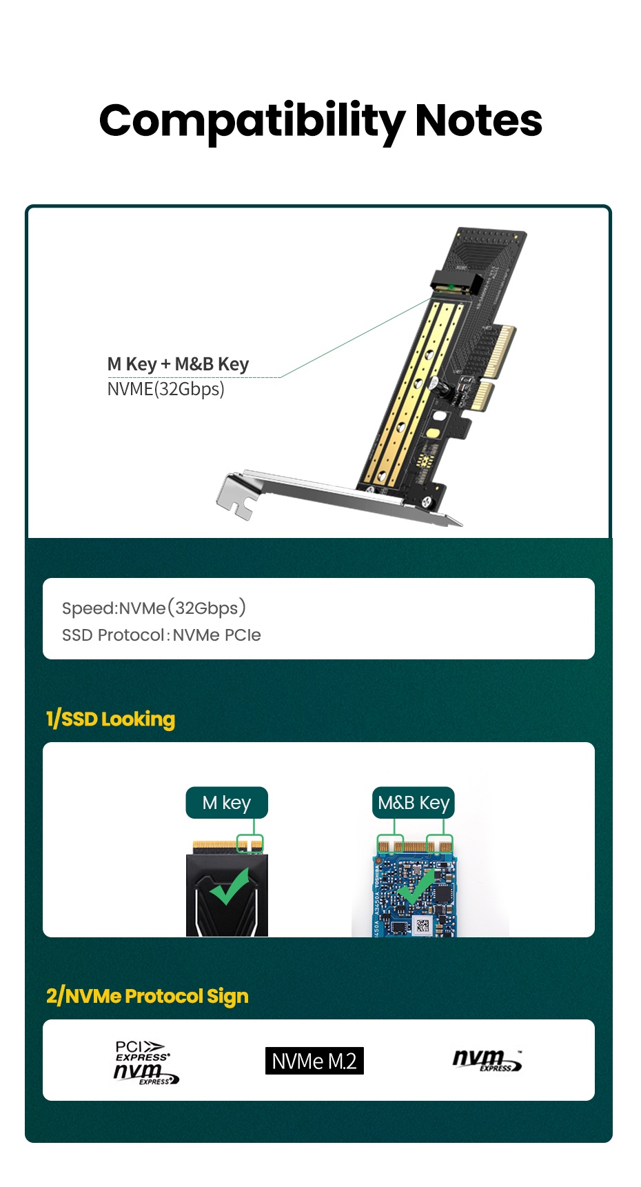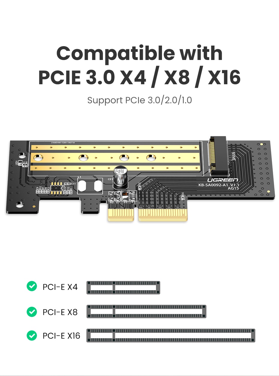 Tương thích với bo mạch chủ PCI-e 3.0 và tương thích ngược với PCIe 2.0 và PCIe 1.0. Bộ điều hợp hỗ trợ PCIe 3.0 x4 NVMe (M Key) và PCIe AHCI M.2 SSD bao gồm ổ 2230, 2242, 2260 và 2280