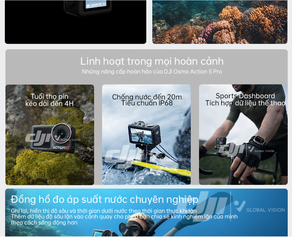 Nếu DJI Action 4 chống nước ở độ sâu 18m, thì đến với DJI Action 5 Pro đã được nâng cấp đến 20m.