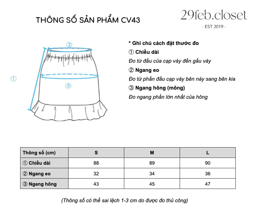 - Bảng Size mang tính chất tham khảo, có thể chênh lệch so với thực tế 1-3cm, bạn vui lòng chat cho Shop để được tư vấn kĩ hơn bạn nhé. 29feb.closet xin cảm ơn.